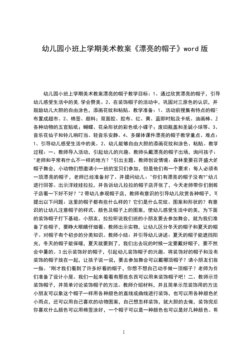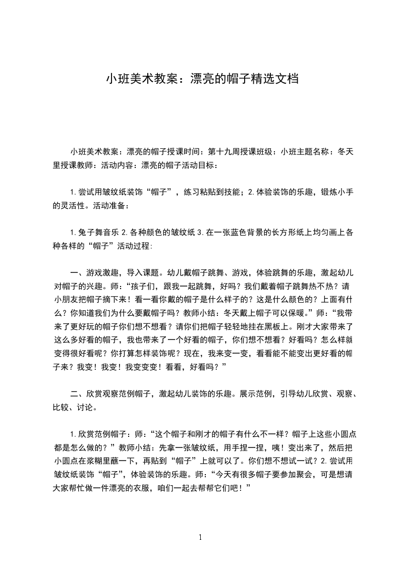 小班美术教案:漂亮的帽子授课时间:第十九周授课班级:小班主题名称:冬天里授课教师:活动内容:漂亮的帽子活动目标: