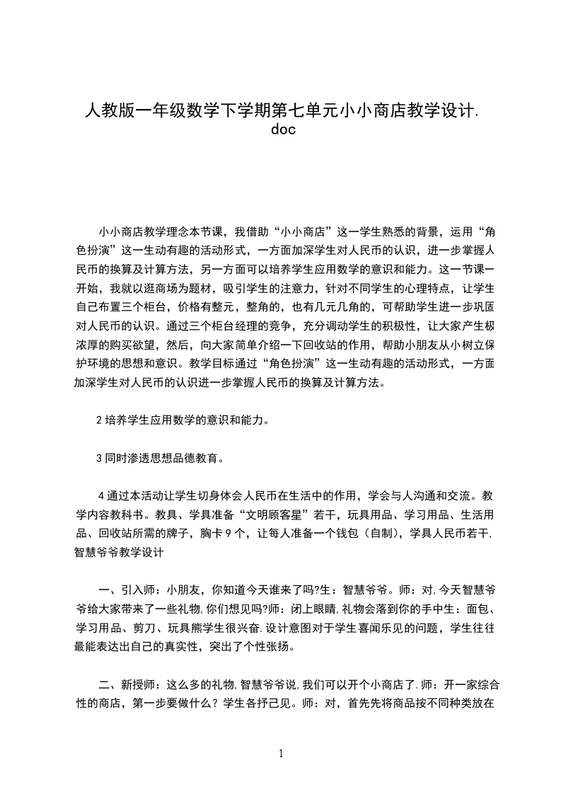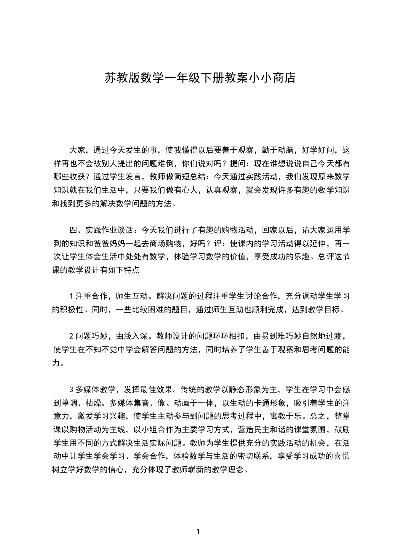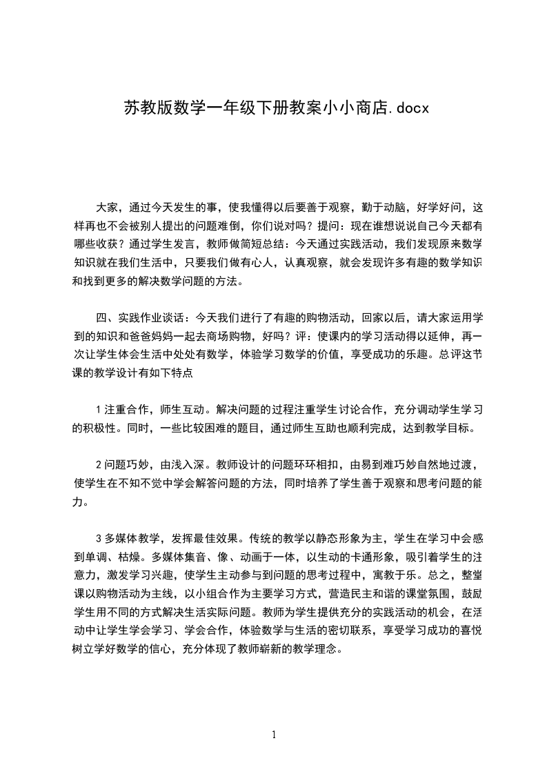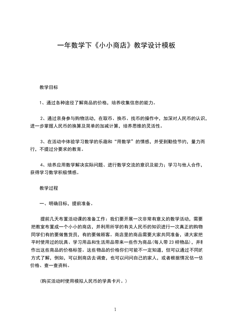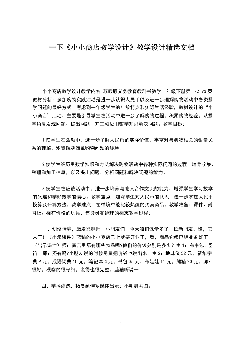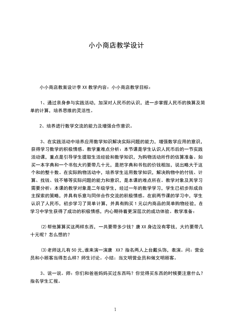 小小商店教学设计教学内容:苏教版义务教育教科书数学一年级下册第72-73页。教材分析:参加购物实践活动是进一步认识人民币以及进一步理解购物活动中各类数学问题的最好方式。考虑到一年级学生的年龄特点和实际生活经验,教材设计的“小小商店”活动,主要是引导学生在活动中进一步了解购物过程,积累购物经验,从数学角度发现问题、提出问题,并主动应用数学知识解决问题。教学目标: