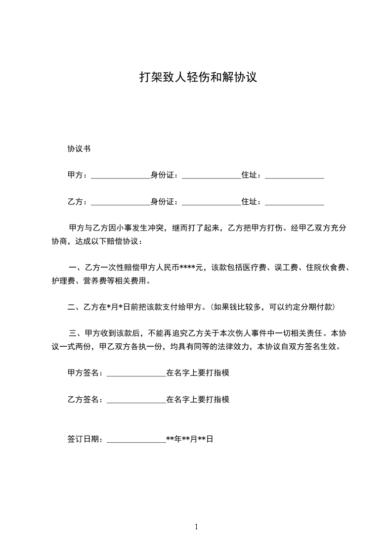 三、甲方收到该款后,不能再追究乙方关于本次伤人事件中一切相关责任。本协议一式两份,甲乙双方各执一份,均具有同等的法律效力,本协议自双方签名生效。