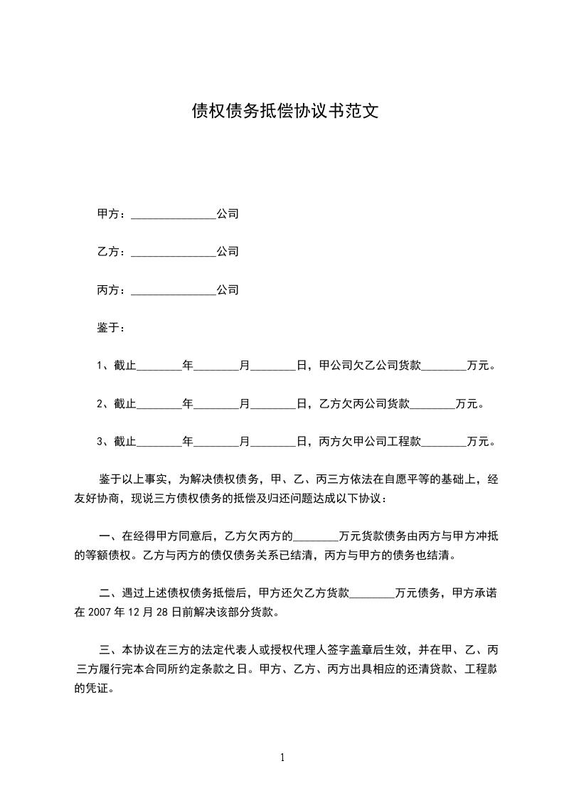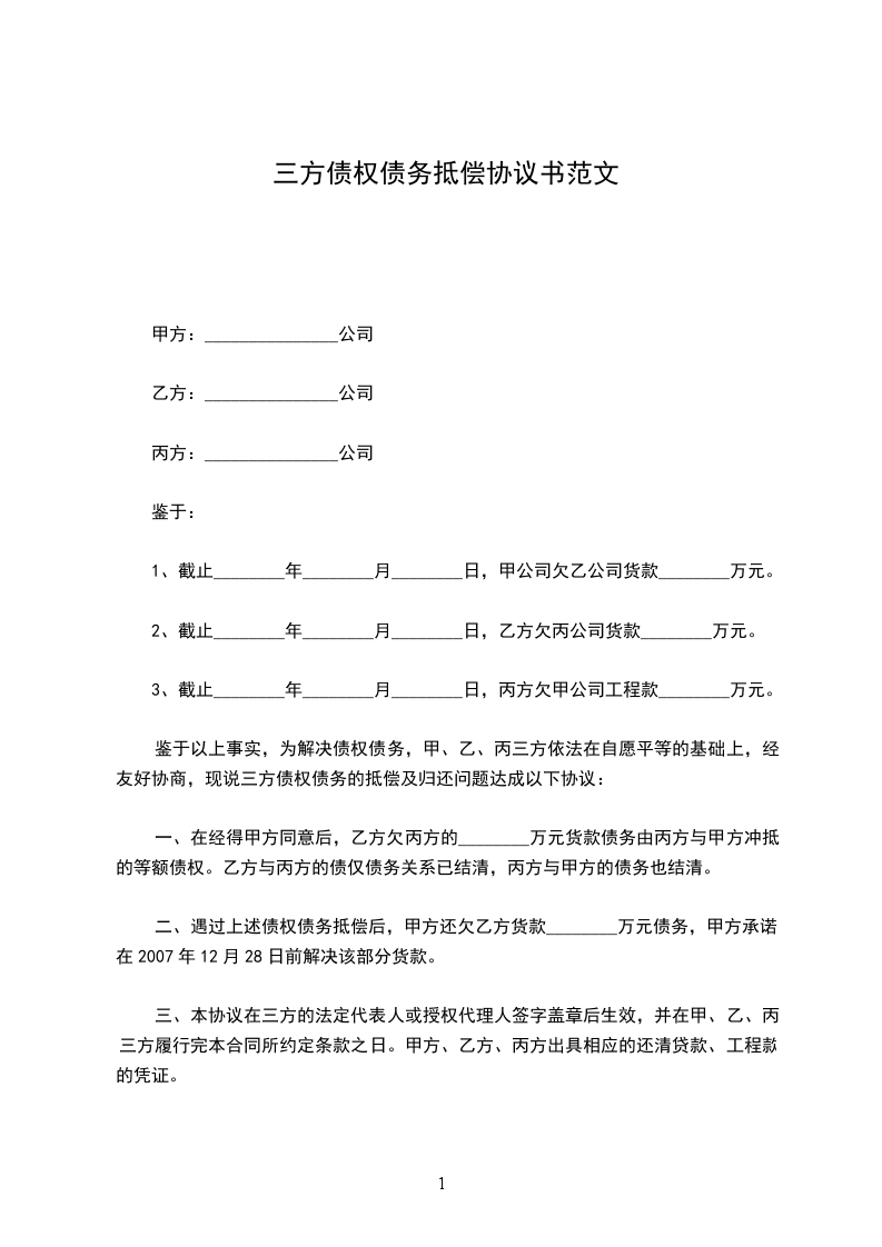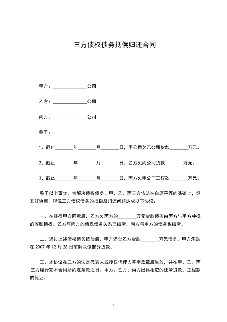 鉴于以上事实,为解决债权债务,甲、乙、丙三方依法在自愿平等的基础上,经友好协商,现说三方债权债务的抵偿及归还问题达成以下协议: