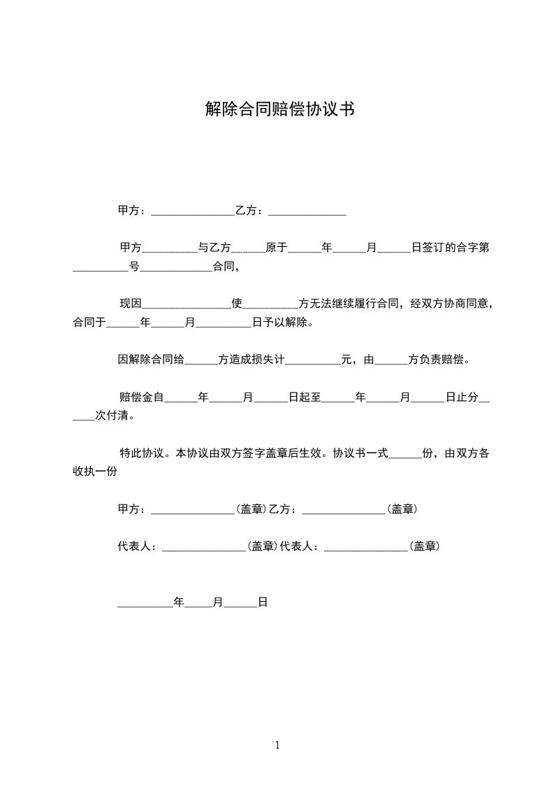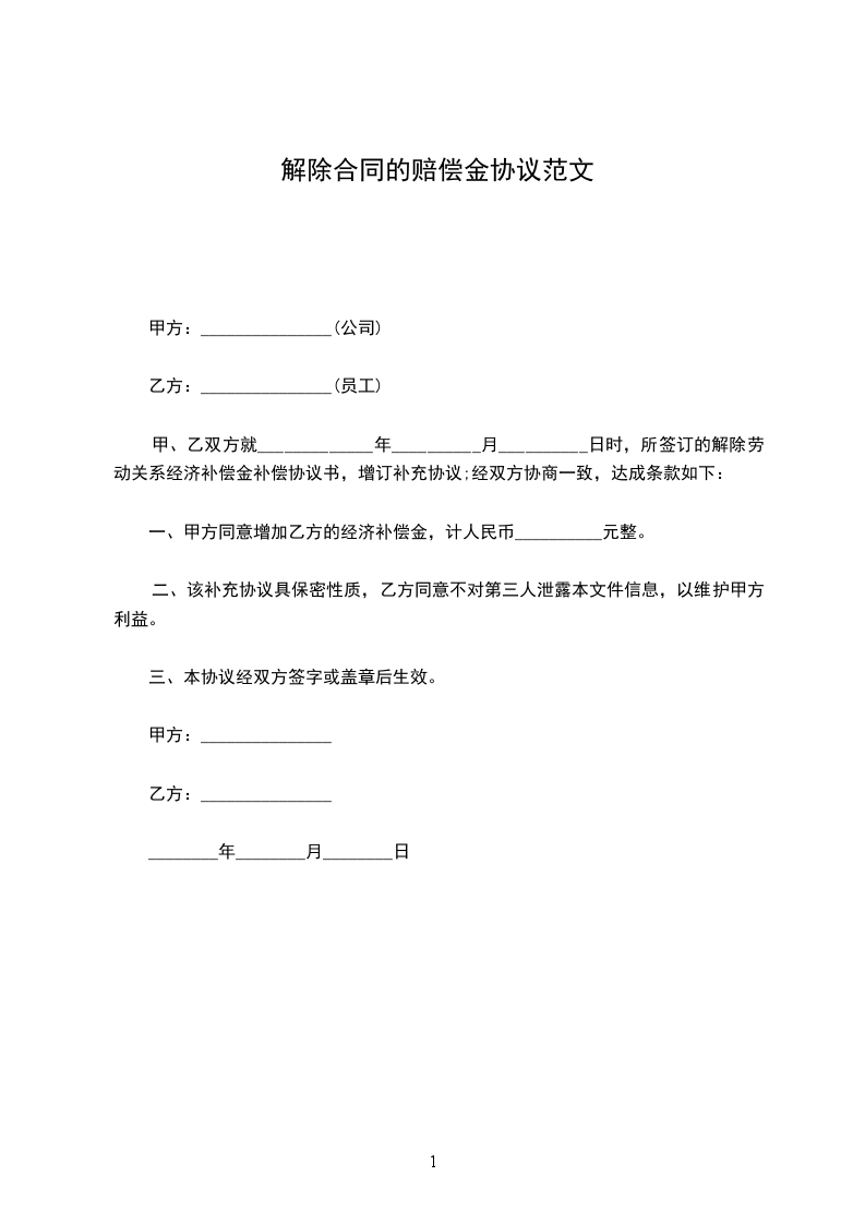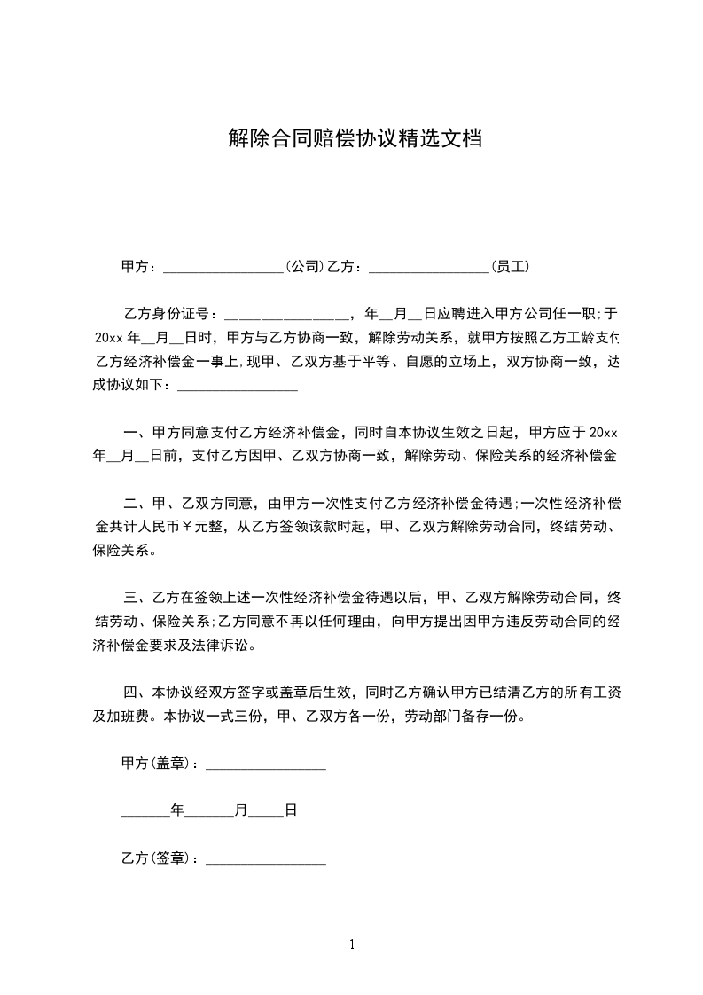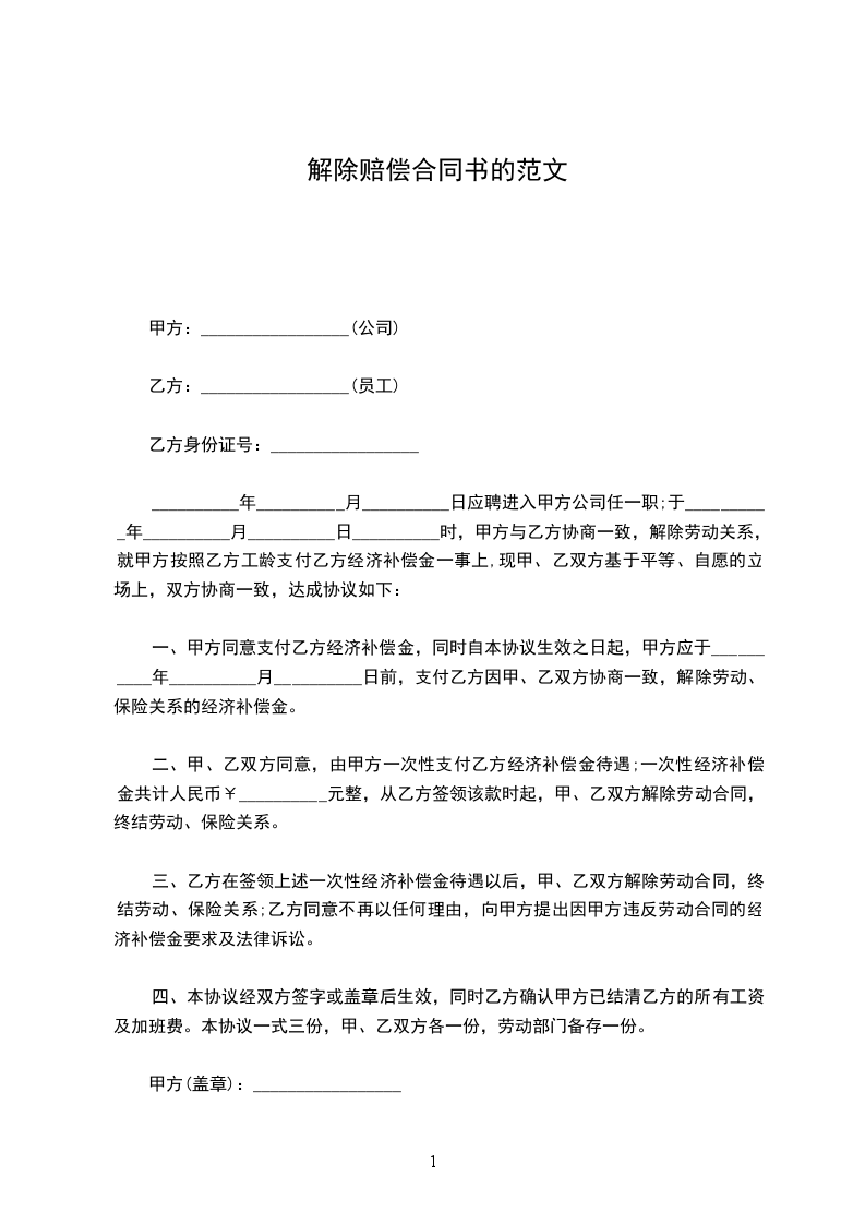 二、甲、乙双方同意,由甲方一次性支付乙方经济补偿金待遇;一次性经济补偿金共计人民币¥__________元整,从乙方签领该款时起,甲、乙双方解除劳动合同,终结劳动、保险关系。
