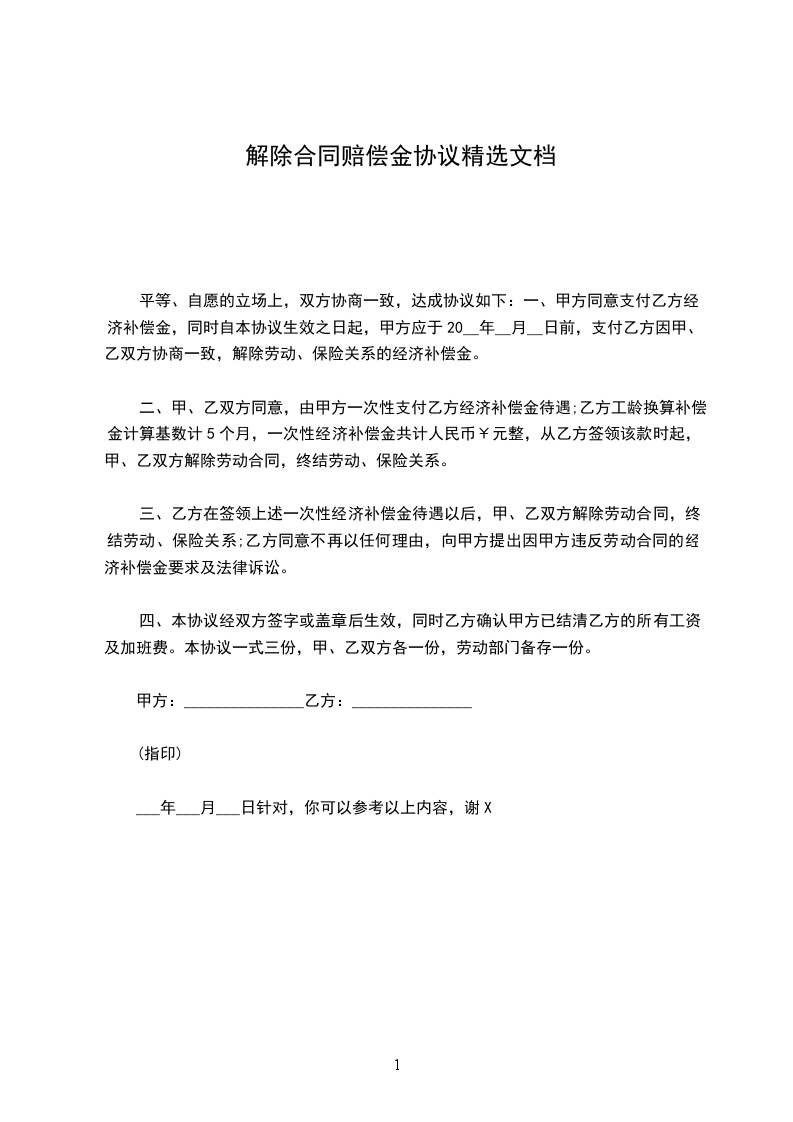 一、甲方同意支付乙方经济补偿金,同时自本协议生效之日起,甲方应于__________年__________月__________日前,支付乙方因甲、乙双方协商一致,解除劳动、保险关系的经济补偿金。