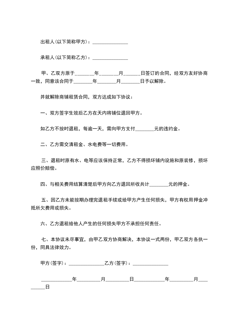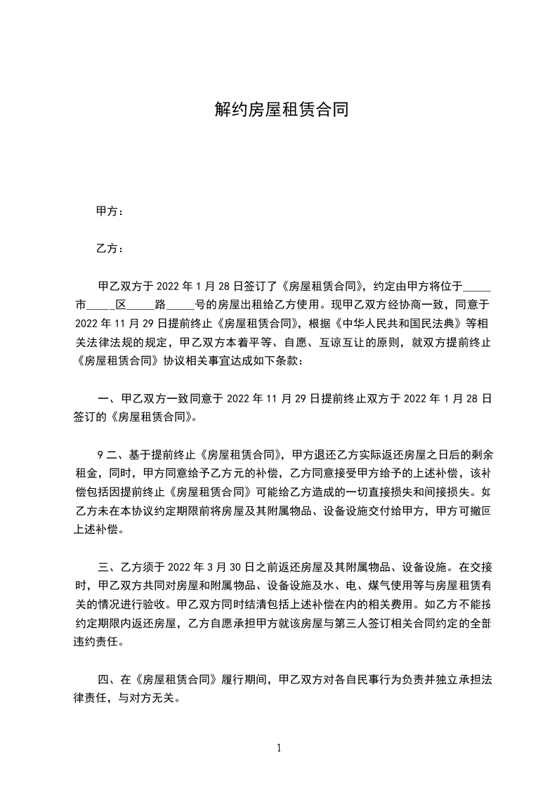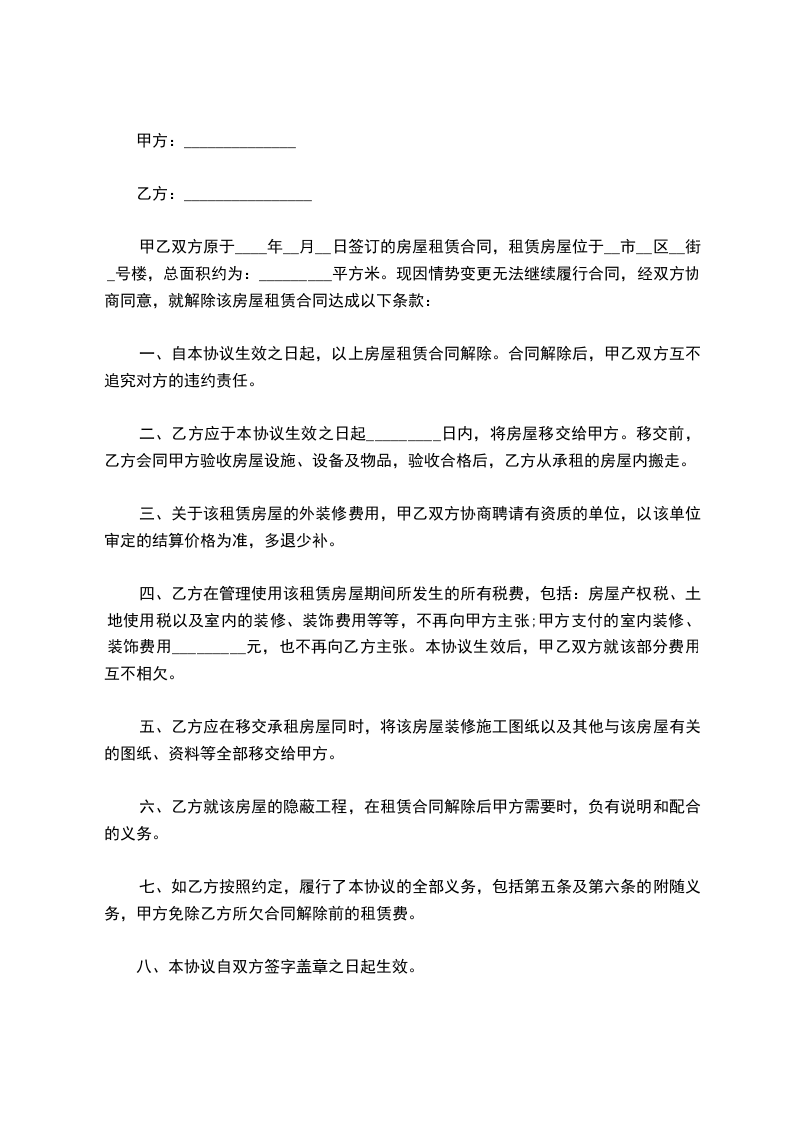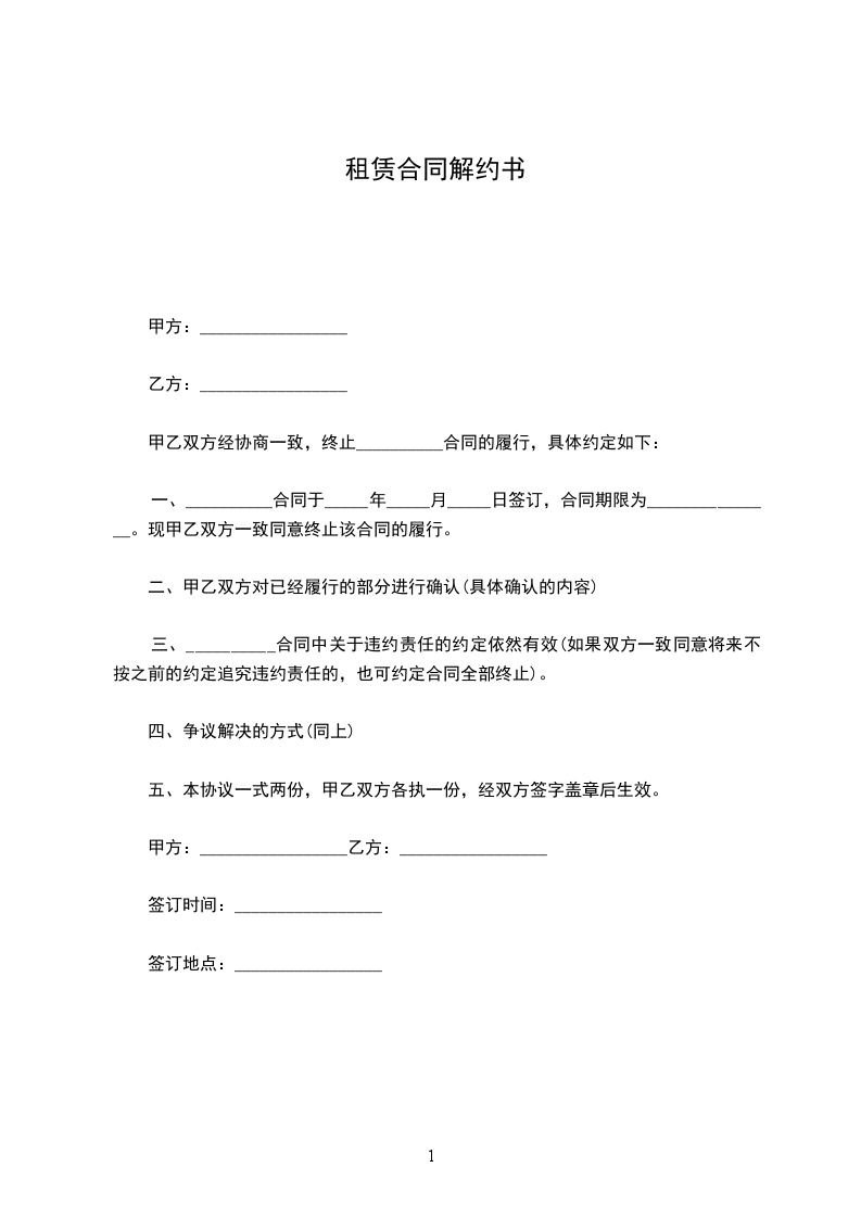 一、__________合同于_____年_____月_____日签订,合同期限为_______________。现甲乙双方一致同意终止该合同的履行。