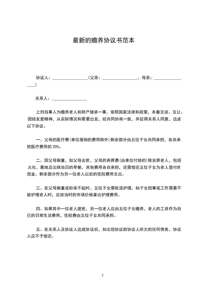 上列当事人为赡养老人和财产继承一事,依照国家法律和政策,本着互谅、互让、团结友爱精神,从实际情况和需要出发,经共同协商一致,并征得关系人同意,达成以下协议。