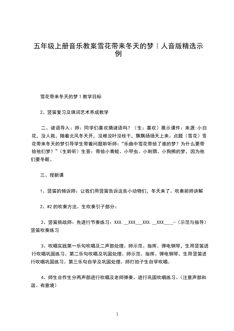二、谜语导入:师:同学们喜欢猜谜语吗?(生:喜欢)展示课件:来源:小白花,没人栽,随着北风冬天开,没根没叶没枝干,飘飘扬扬天上来。点题(雪花)雪花带来冬天的梦引导学生带着问题聆听师:“乐曲中雪花带给了谁的梦?为什么要带给他们梦?”(生聆听)生答:带给小青蛙、小甲虫、小刺猬、小狗熊的梦,因为他们要冬眠。