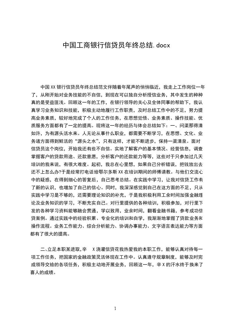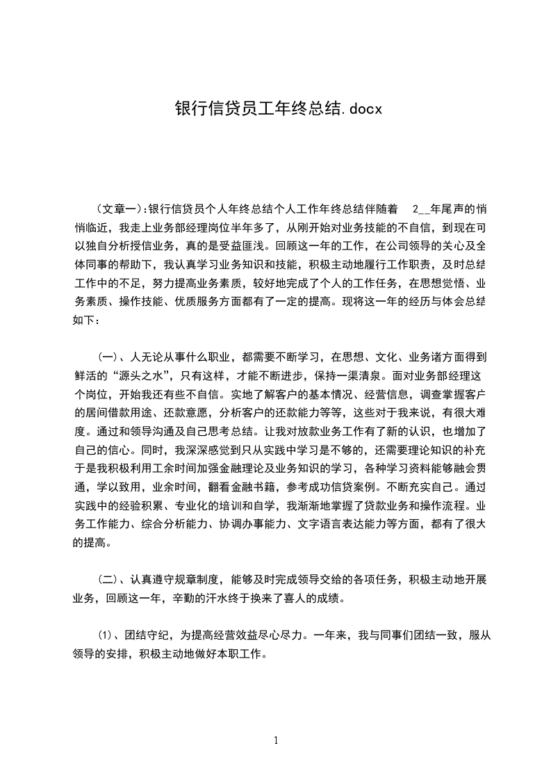 (文章二):银行信贷员年终工作总结2__年度工作总结尊敬的各位领导、同事,大家下午好:紧张忙碌的2__年已经过去,对于这过去的一年,每个人的心情都是不一样的,有人满意,有人遗憾,既有欣慰,也有彷徨。而对我来说,这一年是我工作生涯的一个重要转折,也将会是我未来的一个里程碑。进入XX参加工作以来,我遵照行里的安排,在基层网点参与了一年的柜面工作。普通柜员的工作是平淡而又忙碌的,从刚开始的不适应到后来的从容,这个过程中并没有特别惊人的成绩,却让我在这个过程中懂得了工作的不易以及一个员工所应肩负的责任。自今年9月以来,我有幸来到分行公司业务部参加工作,并加入了我们营销五团队这个优秀的工作团队。刚来的那段时间,整个人都是兴奋而又充满新奇感的,能够从事银行的核心业务工作无疑是一种幸运。但是我也明白,作为新加入部门的实习员工,我们的主要工作还是学习。于是在最初的这段时间,指导性材料,相关文件以及过往的业务档案就成了我最亲密的“战友”。在各位优秀的客户经理的帮助下,我逐渐对银行的公司业务有了全新的认识,也理清了我后续学习的思路,并对将来的工作情况有了进一步的规划,那就是踏踏实实,打好基础,从一点一滴做起,不断的积累充实自己,做一个优秀的员工。
