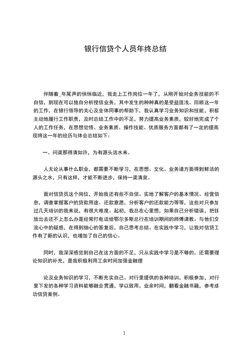 (文章一):银行信贷员个人年终总结个人工作年终总结伴随着2__年尾声的悄悄临近,我走上业务部经理岗位半年多了,从刚开始对业务技能的不自信,到现在可以独自分析授信业务,真的是受益匪浅。回顾这一年的工作,在公司领导的关心及全体同事的帮助下,我认真学习业务知识和技能,积极主动地履行工作职责,及时总结工作中的不足,努力提高业务素质,较好地完成了个人的工作任务,在思想觉悟、业务素质、操作技能、优质服务方面都有了一定的提高。现将这一年的经历与体会总结如下: