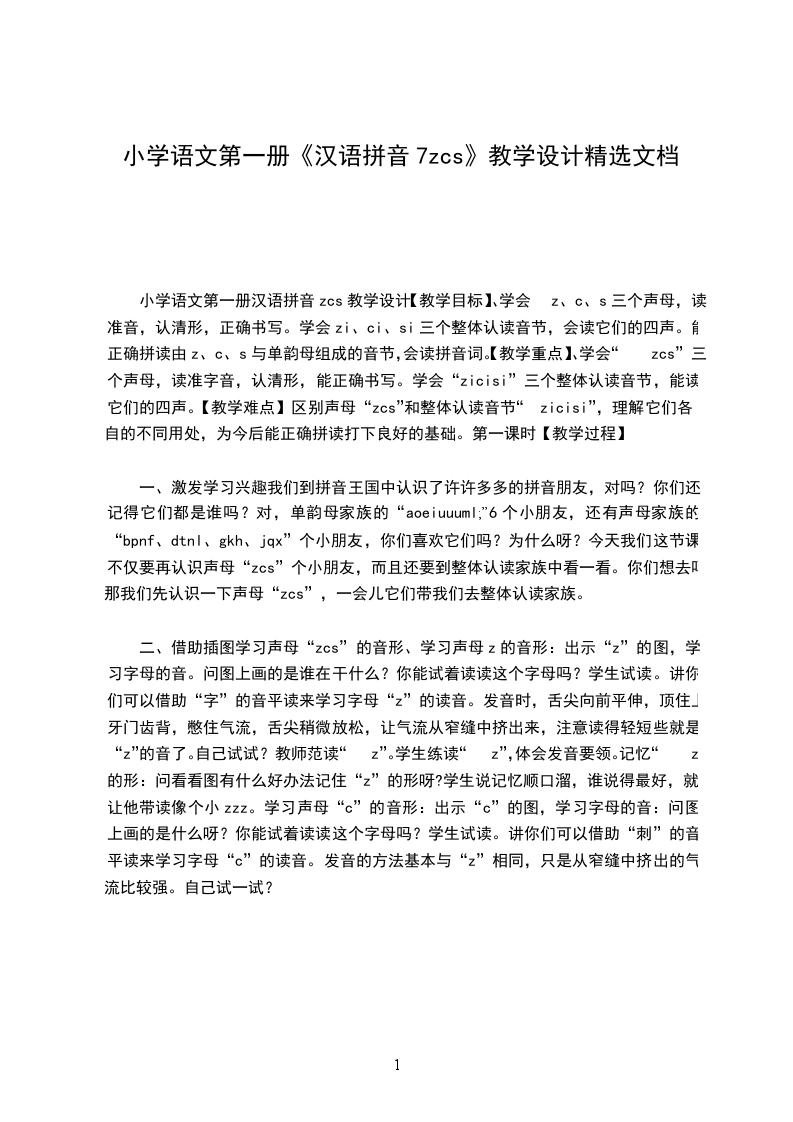 小学语文第一册汉语拼音zcs教学设计【教学目标】、学会z、c、s三个声母,读准音,认清形,正确书写。学会zi、ci、si三个整体认读音节,会读它们的四声。能正确拼读由z、c、s与单韵母组成的音节,会读拼音词。【教学重点】、学会“zcs”三个声母,读准字音,认清形,能正确书写。学会“zicisi”三个整体认读音节,能读它们的四声。【教学难点】区别声母“zcs”和整体认读音节“zicisi”,理解它们各自的不同用处,为今后能正确拼读打下良好的基础。第一课时【教学过程】