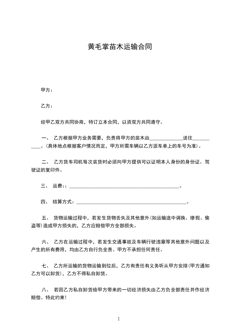 一、 乙方根据甲方业务需要,负责将甲方的苗木由______________送往___________。(具体地点根据客户情况而定,甲方所需车辆以乙方派车单上的车号为准)。