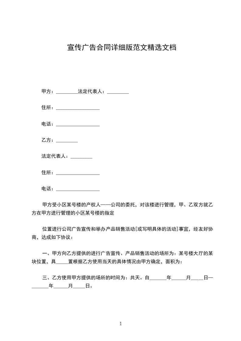 一、甲方向乙方提供的进行广告宣传、产品销售活动的场所为:某号楼大厅的某块位置,具_____置根据乙方使用当天的具体情况由甲方确定,面积为: