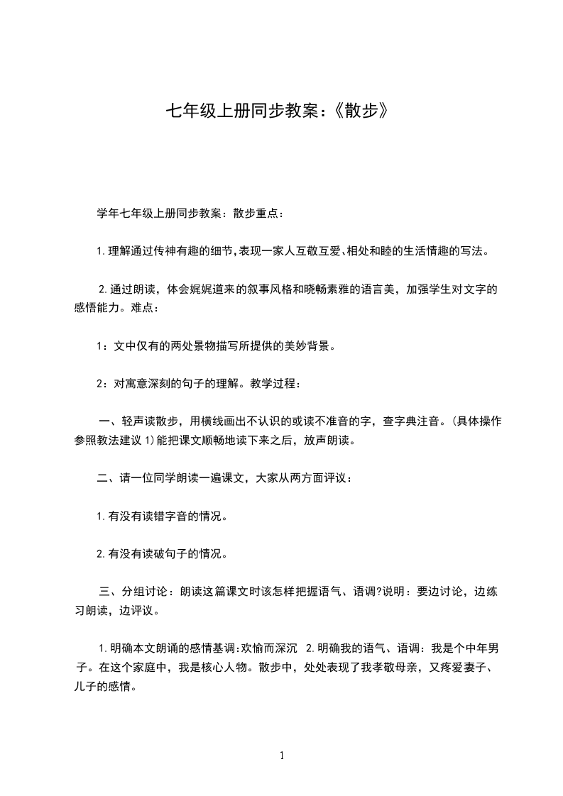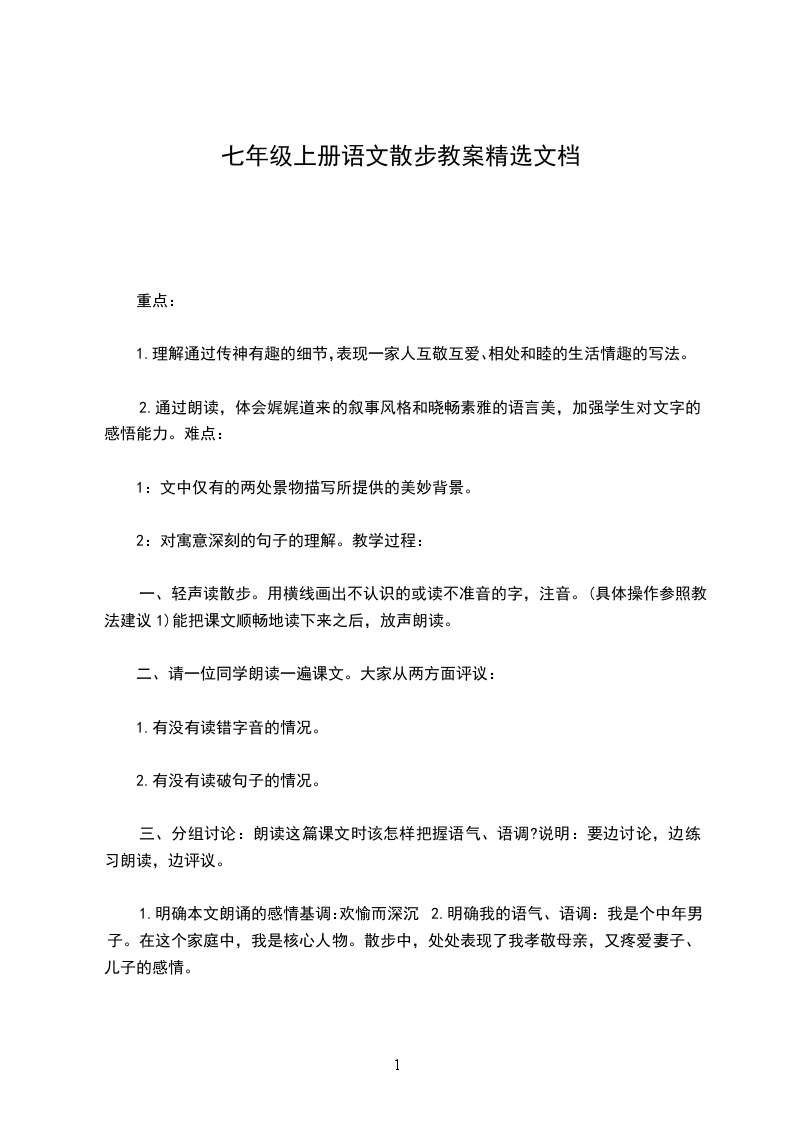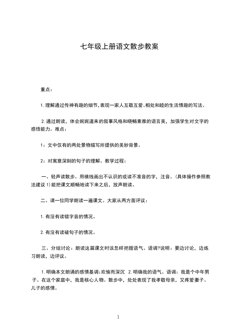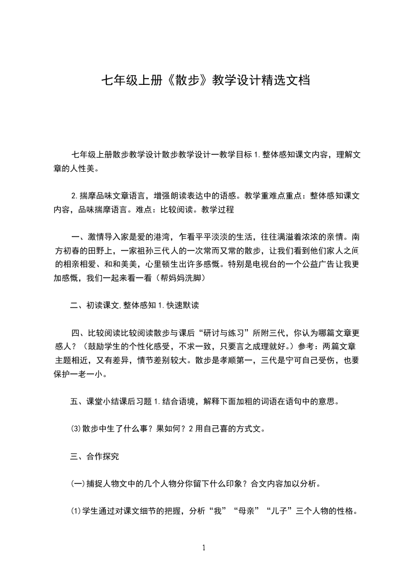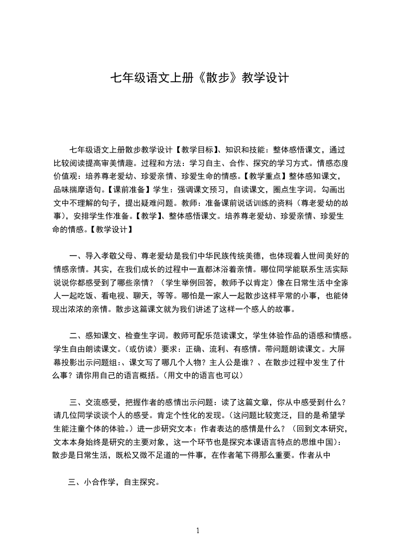 七年级上册散步教学设计散步教学设计一教学目标1.整体感知课文内容,理解文章的人性美。