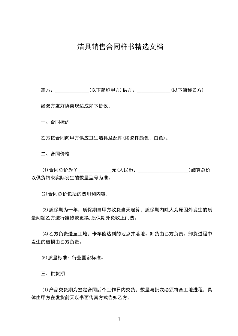 乙方按合同向甲方供应卫生洁具及配件(陶瓷件颜色:白色)。
