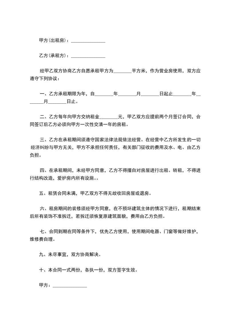 经甲乙双方协商乙方自愿承租甲方为________平方米,作为营业房使用,双方应遵守下列协议: