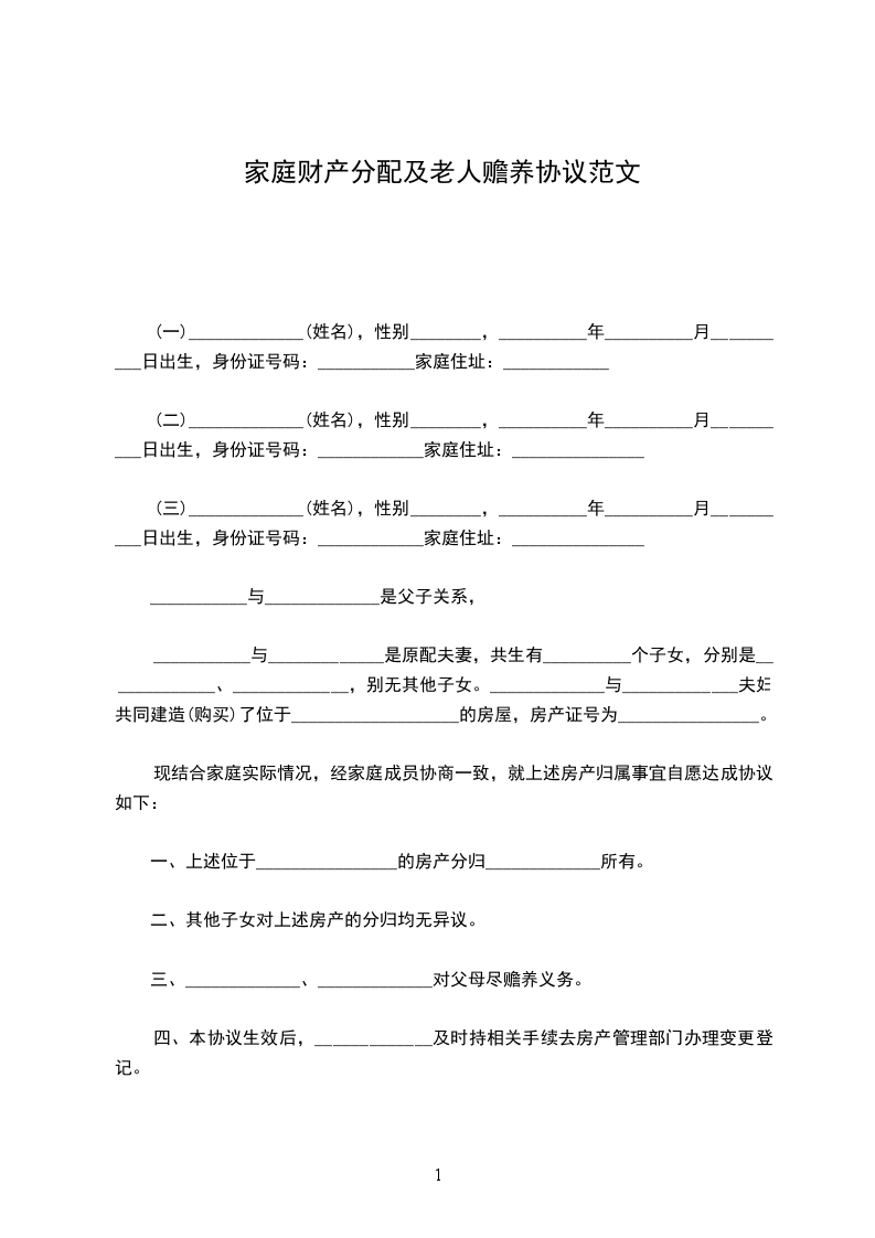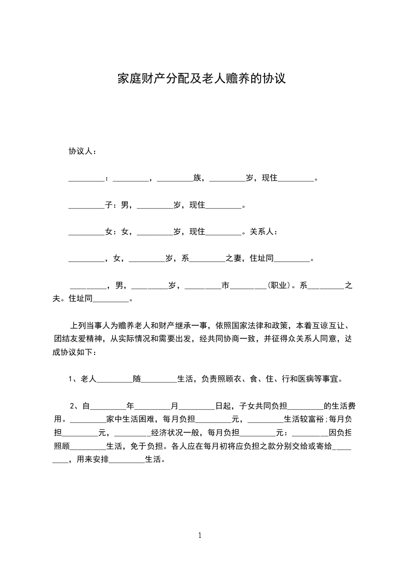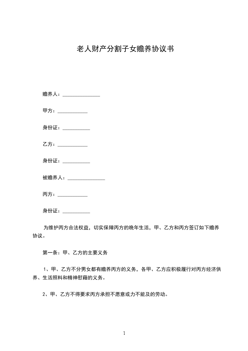 甲方_______________,男,________年________月________日生人,现年________岁。_______________,女,________年________月________日生人,现年________岁。由于两位老人年迈,生活不能自理,经两位老人同意,乙方和丙方达成赡养老人和甲方身后财产处理协议如下: