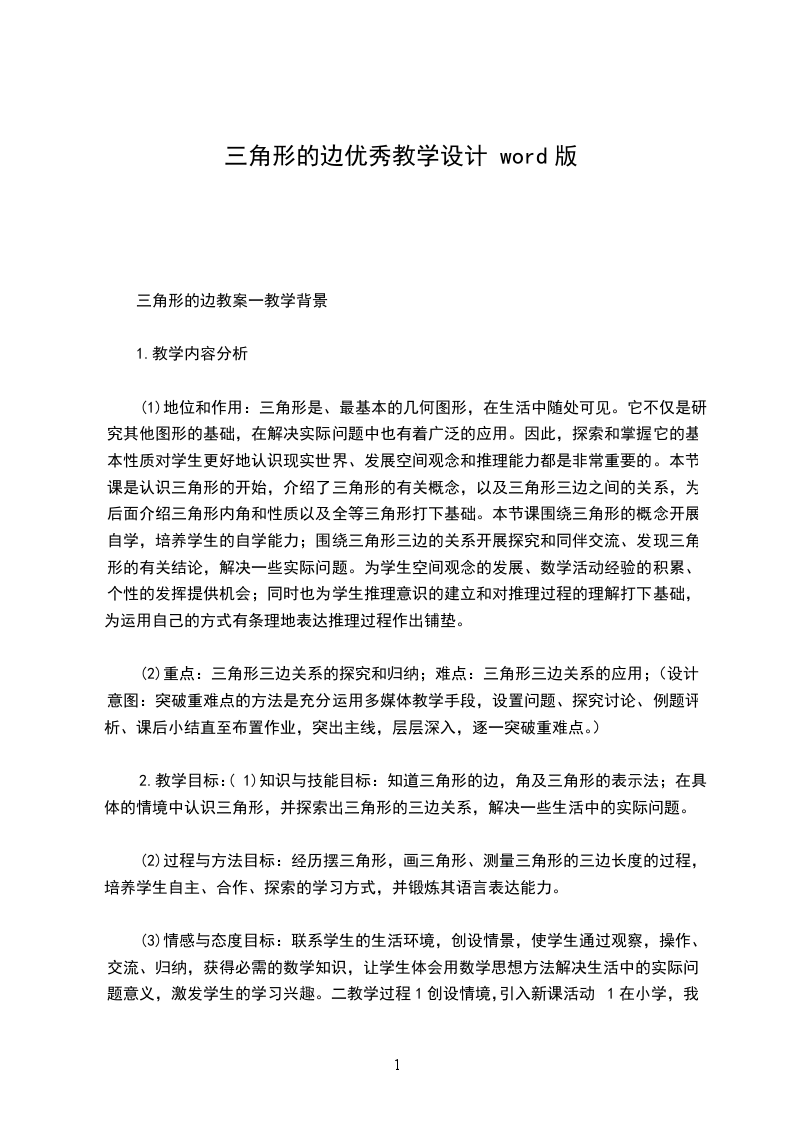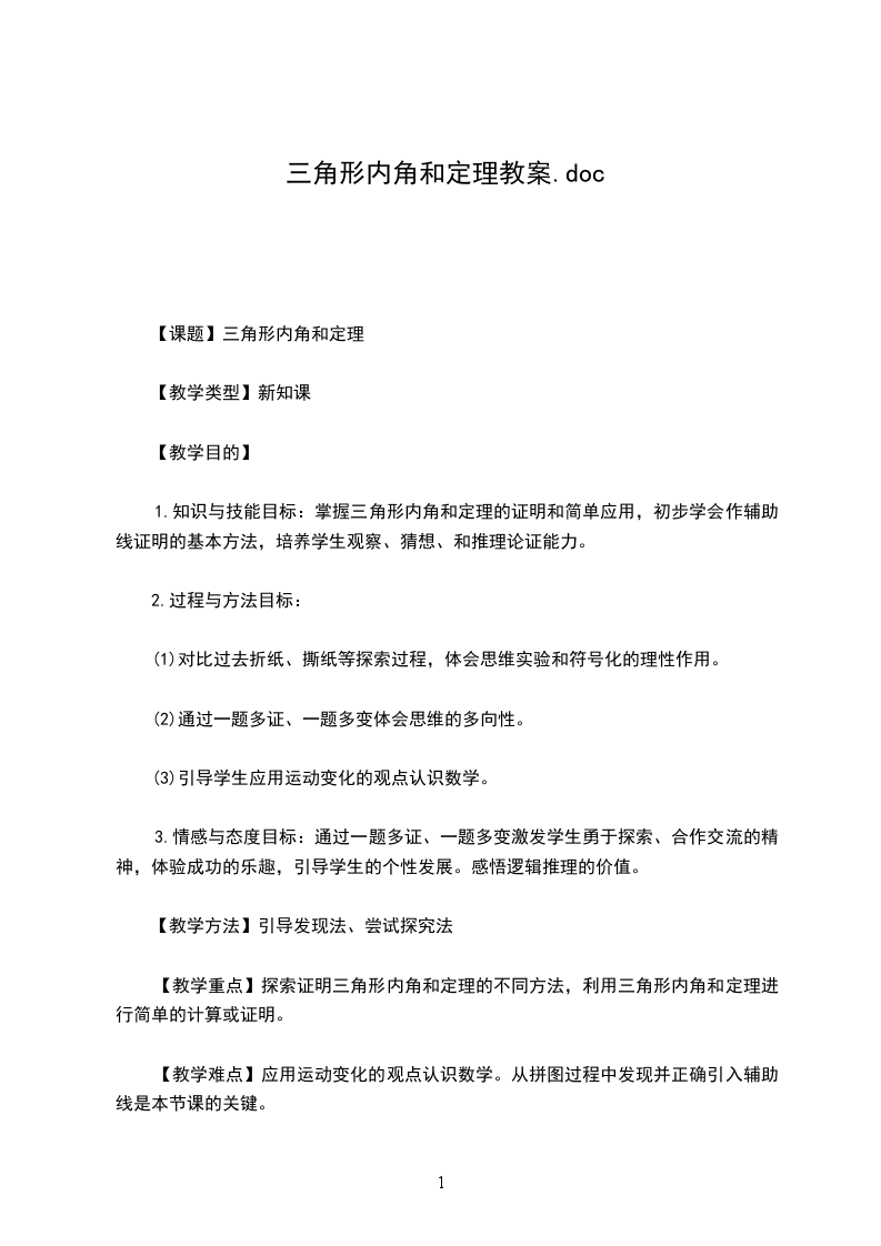 【课程标准】:认识三角形,通过观察、操作、了解三角形内角和是180度。【学情分析】:学生已经掌握了三角形的概念、分类,熟悉了钝角、锐角、平角这些角的知识。对于三角形的内角和是多少度,学生是不陌生的,因为学生有以前认识角、用量角器量三角板三个角的度数以及三角形的分类的基础,学生也有提前预习的习惯,很多孩子都能回答出三角形的内角和是180度,但是他们却不知道怎样才能得出三角形的内角和是180度。另外,经过三年多的学习,学生们已具备了初步的动手操作能力、主动探究能力以及小组合作的能力。【学习目标】: