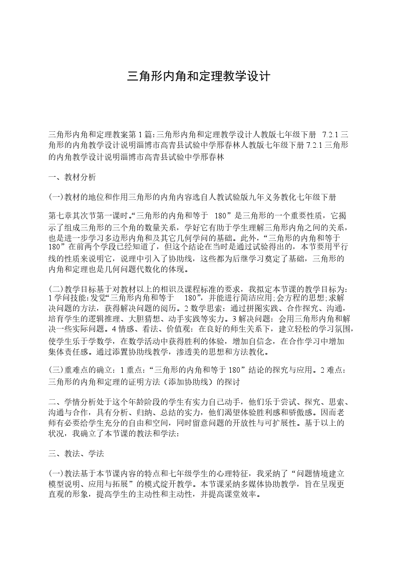 (4)推算法把一个长方形沿对角线分成两个完全一样的直角三角形。因为长方形的内角和是XXX。,所以一个直角三角形的内角和等于180。(课件演示过程)师:直角三角形的内角和已经证明了是180。,现在我们只要能证明:锐角三角形和钝角三角形的内角和也是180。就可以了。课件演示一个锐角三角形,从顶点往下画一条垂线,将三角形分为两个直角三角形,因为我们己经知道直角三角形的内角和是180。,所以两个直角三角形的度数和就是XXX。,减去两个直角的和180,就是要证明的三角形内角和,肯定是180。4.总结提炼师:孩子们,刚才我们通过“量一一拼一一折推”的方法分类验证了三角形的内角和是()度?现在可以下结论了吗?(板书:三角形三个内角和等于180。)师:那在“三角形的争吵中”谁是对的?(达成目标3。此环节让学生通过“量一一拼折推”的方法分类验证了三角形的内角和是180度。此环节充分体现了学生学习的主动性。)