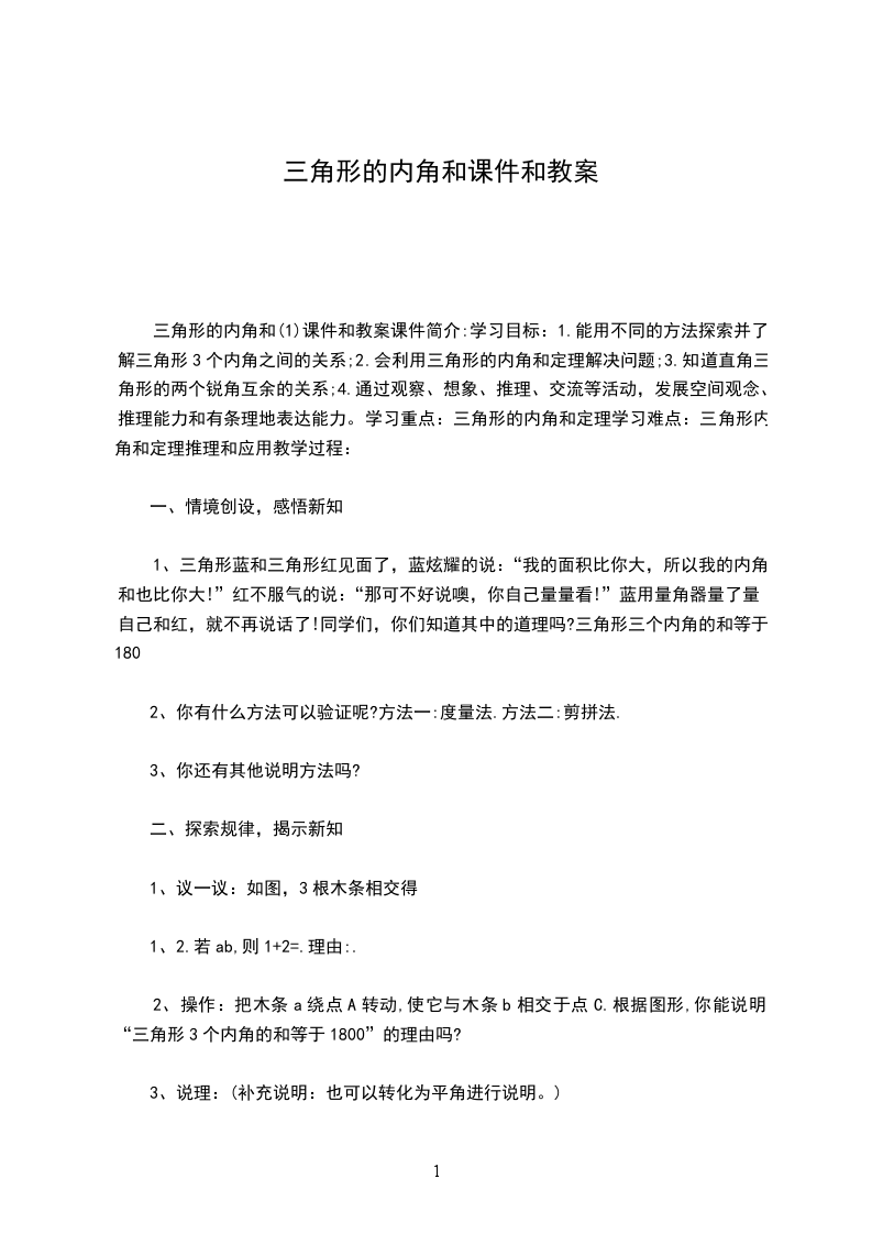 (一)创设情境,生成问题,认识三角形的内角及内角和(播放课件)在图形王国中,有一天,三角形家族里为“三角形内角和的大小”爆发了一场激烈的争吵。钝角三角形大声叫着:“我的钝角大,我的内角和一定比你们的内角和大。”锐角三角形也不示弱:“你虽然有一个钝角,可其它两个角都很小。但是我的三个角都不是很小。我的内角和比你大”。直角三角形说:“别争了,三角形的内角和是180。,我们的内角和是一样大的。”师:动画片看完了,请大家想一想,什么是三角形的内角和?师引导学生说出三角形三个内角的度数和叫做三角形的内角和。多媒体展示:三条线段在围成三角形后,在三角形内形成了三个角(课件闪烁三个角的弧线),我们把三角形内的这三个角,分别叫做三角形的内角(板书:内角),这三个内角的度数的和就叫做三角形的内角和。(达成目标1:利用多媒体播放动画和孩子已有的经验,通过教师的提问和引导,学生说出什么叫三角形的内角及内角和达成目标1O多媒体创设的情景也为目标二打好铺垫)
