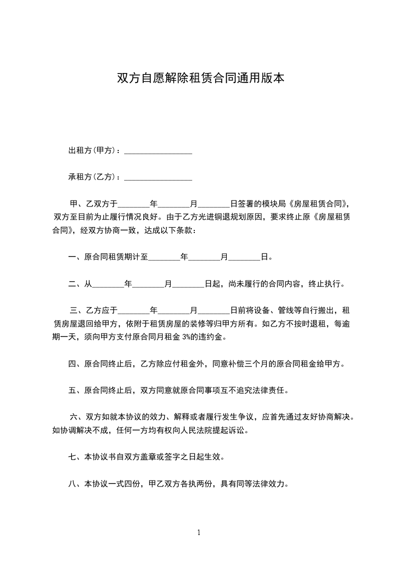 三、乙方应于________年________月________日前将设备、管线等自行搬出,租赁房屋退回给甲方,依附于租赁房屋的装修等归甲方所有。如乙方不按时退租,每逾期一天,须向甲方支付原合同月租金3%的违约金。