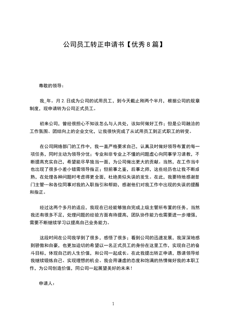我是__部门的___,_年_月_日成为贵公司的试用员工,到今天已经有_个月,试用期已满。在这段时间里,我自认能够完全胜任工作,根据公司的规章制度,现申请转为正式员工。