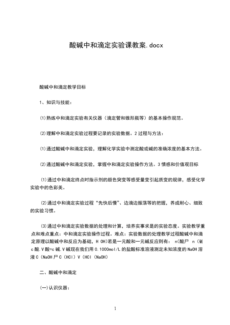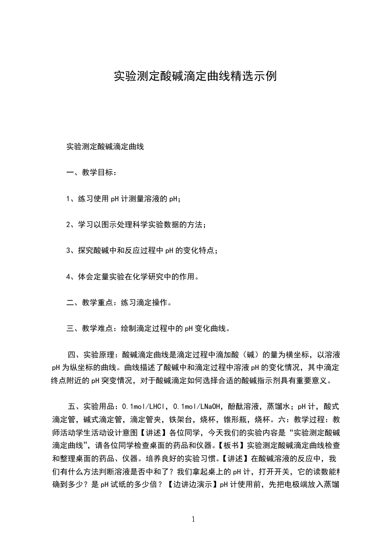 五、实验用品:0.1mol/LHCl,0.1mol/LNaOH,酚酞溶液,蒸馏水;pH计,酸式滴定管,碱式滴定管,滴定管夹,铁架台,烧杯,锥形瓶,烧杯。六:教学过程:教师活动学生活动设计意图【讲述】各位同学,今天我们的实验内容是“实验测定酸碱滴定曲线”,请各位同学检查桌面的药品和仪器。【板书】实验测定酸碱滴定曲线检查和整理桌面的药品、仪器。培养良好的实验习惯。【讲述】在酸碱溶液的反应中,我们有什么方法判断溶液是否中和了?我们拿起桌上的pH计,打开开关,它的读数能精确到多少?是pH试纸的多少倍?【边讲边演示】pH计使用前,先把电极端放入蒸馏水中清洗,用滤纸轻轻擦干,打开开关,插入待测液中就可以读数了。每次使用或保存,重复上述操作即可。【回答】用pH试纸或pH计。【回答】精确到0.1,是pH试纸的10倍。学习pH计的使用方法。【讲述】接着我再来介绍另一种仪器“滴定管”,滴定管是内径均匀、带有刻度的细长玻璃管,请大家看看0刻度在哪里?最大量程是多少?一大格是多少mL?一小格多少mL?滴定管读数精确到0.1mL,还可以估读到0.01mL。【练习】请大家看看我这幅图的读数是多少?【回答】0刻度在最上方;最大量程是25mL;一大格是1mL;一小格是0.1mL。【回答】9.95mL认识滴定管的结构。【讲述】滴定管有两种,分别是酸式滴定管和碱式滴定管。【提问】酸式滴定管不能装碱性溶液,为什么?【回答】碱和玻璃中SiO2反应,生成硅酸钠,使玻璃活塞无法使用。使用滴定管的注意事项【板书】实验步骤