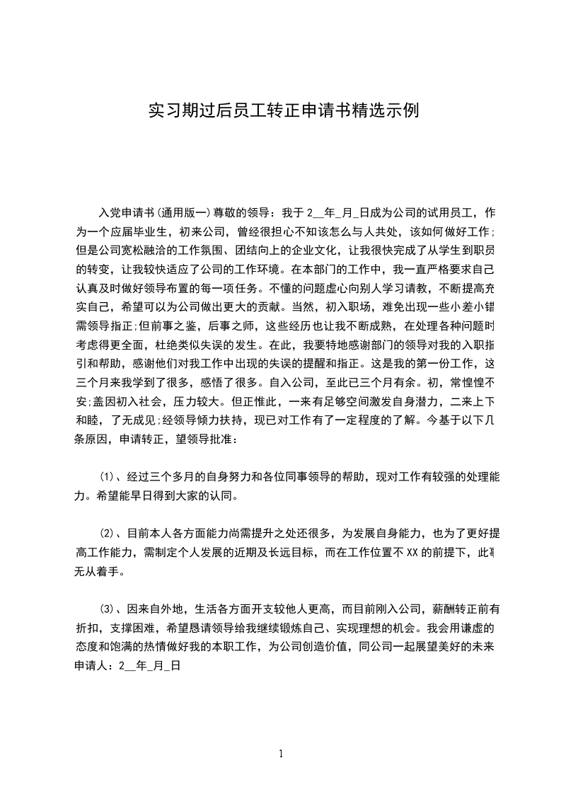 入党申请书(通用版一)尊敬的领导:我于2__年_月_日成为公司的试用员工,作为一个应届毕业生,初来公司,曾经很担心不知该怎么与人共处,该如何做好工作;但是公司宽松融洽的工作氛围、团结向上的企业文化,让我很快完成了从学生到职员的转变,让我较快适应了公司的工作环境。在本部门的工作中,我一直严格要求自己,认真及时做好领导布置的每一项任务。不懂的问题虚心向别人学习请教,不断提高充实自己,希望可以为公司做出更大的贡献。当然,初入职场,难免出现一些小差小错需领导指正;但前事之鉴,后事之师,这些经历也让我不断成熟,在处理各种问题时考虑得更全面,杜绝类似失误的发生。在此,我要特地感谢部门的领导对我的入职指引和帮助,感谢他们对我工作中出现的失误的提醒和指正。这是我的第一份工作,这三个月来我学到了很多,感悟了很多。自入公司,至此已三个月有余。初,常惶惶不安;盖因初入社会,压力较大。但正惟此,一来有足够空间激发自身潜力,二来上下和睦,了无成见;经领导倾力扶持,现已对工作有了一定程度的了解。今基于以下几条原因,申请转正,望领导批准: