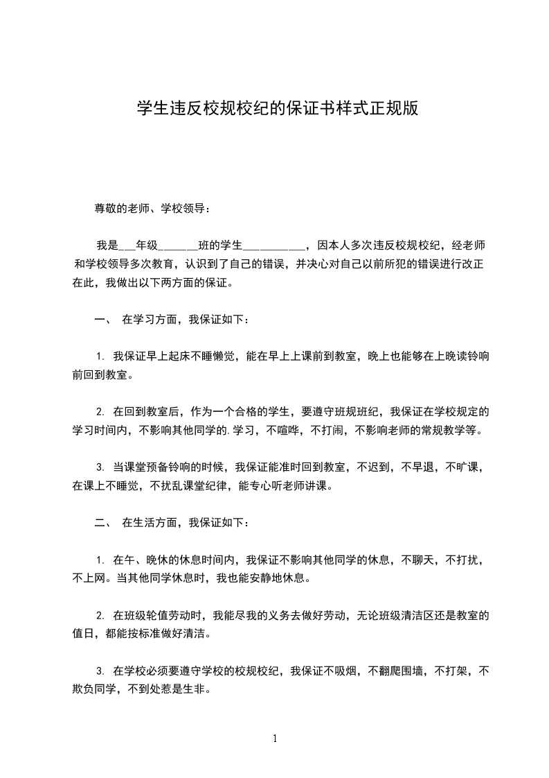 我是___年级_______班的学生___________,因本人多次违反校规校纪,经老师和学校领导多次教育,认识到了自己的错误,并决心对自己以前所犯的错误进行改正。在此,我做出以下两方面的保证。