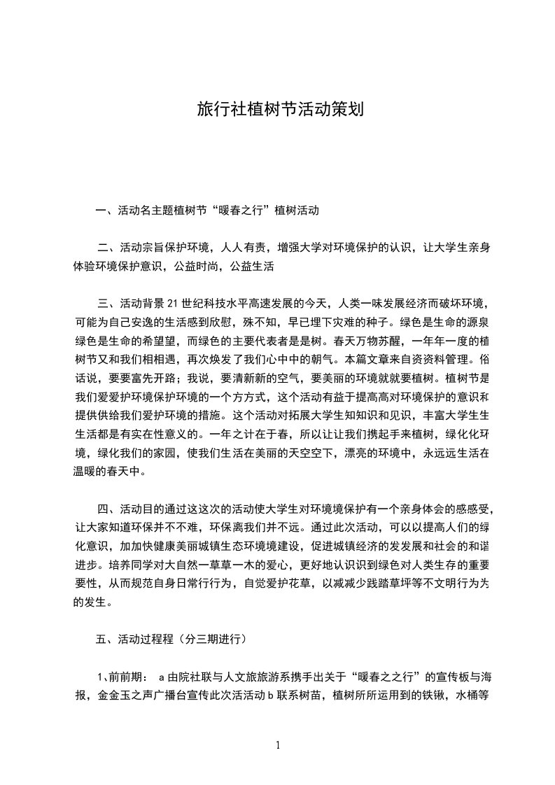 1、前前期:a由院社联与人文旅旅游系携手出关于“暖春之之行”的宣传板与海报,金金玉之声广播台宣传此次活活动b联系树苗,植树所所运用到的铁锹,水桶等工工具,联系摄影师c寻找找植树地点d准备若干娱娱乐节目,在植树过后表演演,缓解师生疲劳e请有有意想植树的同学踊跃报名名参加,报名点,14栋下下