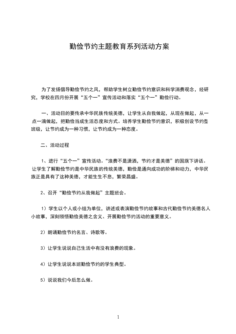 为了发扬倡导勤俭节约之风,帮助学生树立勤俭节约意识和科学消费观念,经研究,学校在四月份开展“五个一”宣传活动和落实“五个一”勤俭行动。