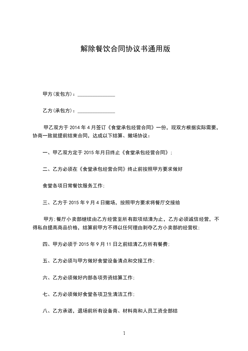 甲乙双方于2024年4月签订《食堂承包经营合同》一份,现双方根据实际需要,协商一致就提前结束合同,达成以下结算、撤场协议: