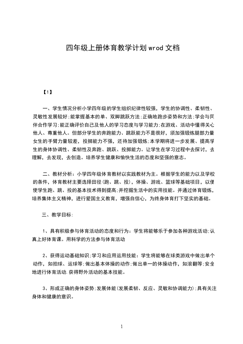 二、教材分析小学四年级体育教材以实践教材为主。根据学生的能力以及学校的条件,体育教材主要选择田径(跑、跳、投),体操、游戏、篮球等基础项目,以便使学生跑、跳、投的基本技术得到提高;并挖掘生活中的实用技能。并通过体育锻炼,培养集体主义精神,进行爱国主义教育,增强自信心,为终身体育打下坚实的基础。本册教材内容有:体育基础知识、田径类的蹲距式跳远和投掷沙包实心球、体操(分腿腾越前后滚翻仰卧推起城桥屈体悬垂摆动)、小足球游戏、韵律体操及民族传统体育的武术基本知识和基本功,队列练习(分队合队交叉行进错肩行进半面左右转跑步立定)还有各种走跑的练习(400米跑50_8往返跑50米快速跑和25米往返跑)。