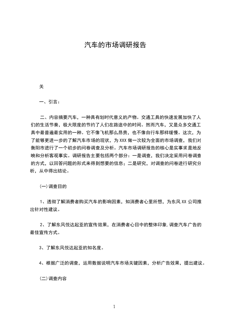 二、内容摘要汽车,一种具有划时代意义的产物。交通工具的快速发展加快了人们的生活节奏,极大限度的节约了人们在路途中的时间。然而汽车,又是众多交通工具中最普遍最实用的一种。它不像飞机那么昂贵,也不像自行车那样缓慢。这次,为了能够更进一步的了解汽车市场的现状,为XXX做一次较为全面的市场调查,我们对衡阳市进行了一个初步的问卷调查及分析。汽车市场调研报告的核心是实事求是地反映和分析客观事实。调研报告主要包括两个部分:一是调查,我们决定采用问卷调查的方式,以回答问题的形式来得到想要的信息;二是研究,对调查的问卷进行研究分析,从中得出结论。