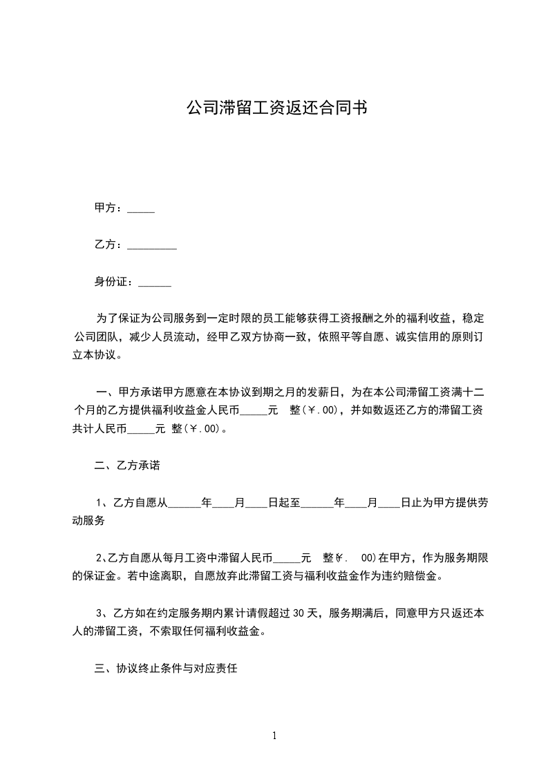 2、因乙方中途停止滞留工资在甲方或离职,以及因乙方违法犯罪遭公安机关拘捕时,协议即时终止,甲方即可免责;