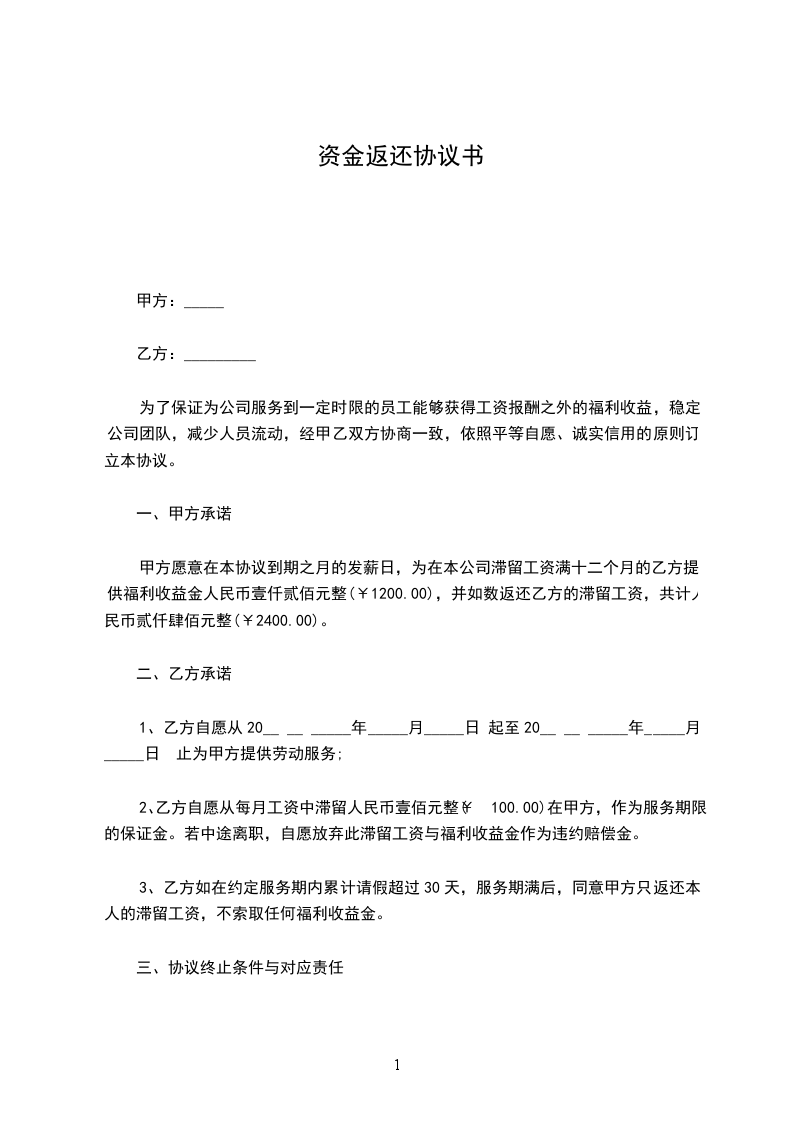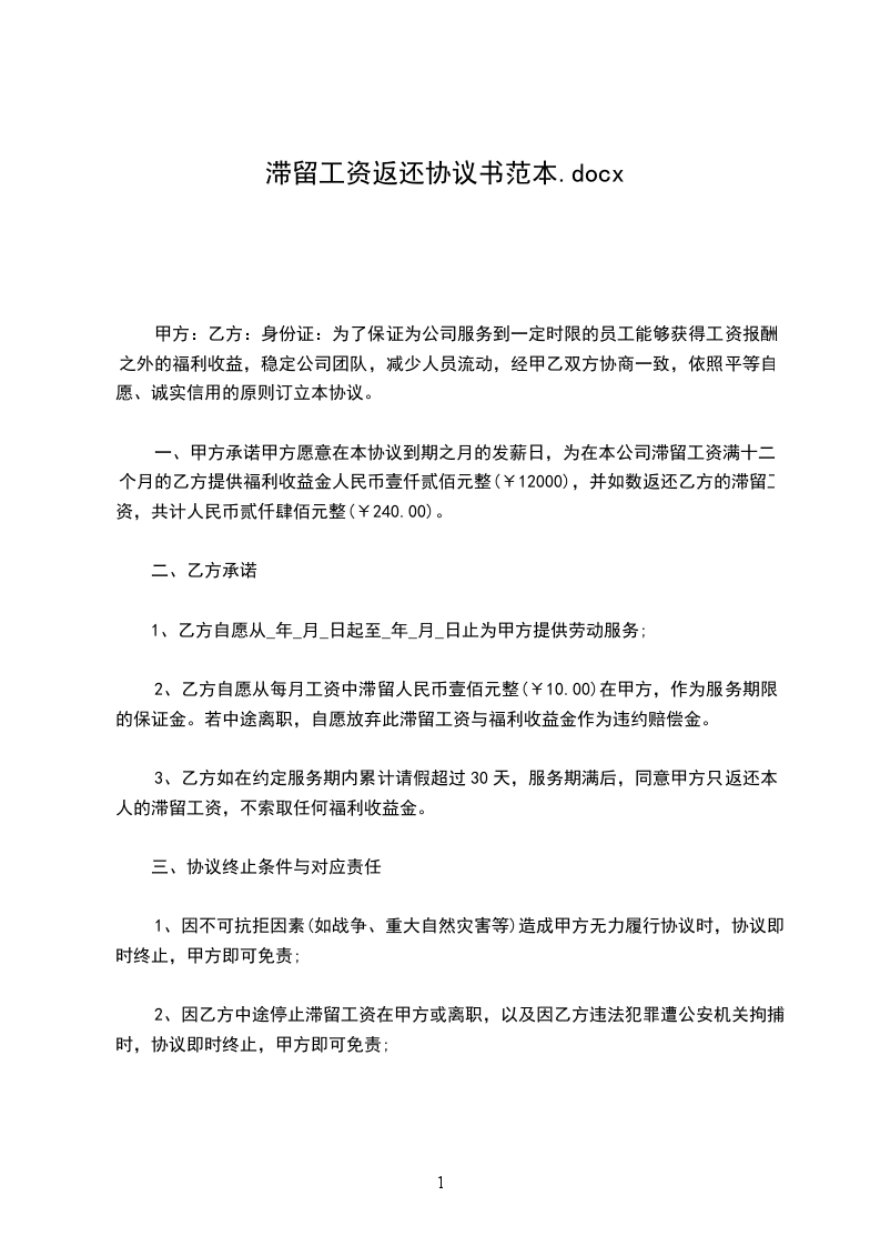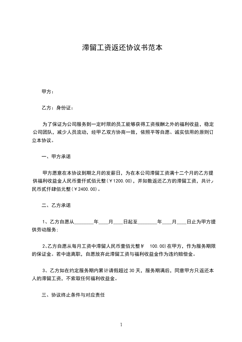 甲方愿意在本协议到期之月的发薪日,为在本公司滞留工资满十二个月的乙方提供福利收益金人民币壹仟贰佰元整(¥1200.00),并如数返还乙方的滞留工资,共计人民币贰仟肆佰元整(¥2400.00)。