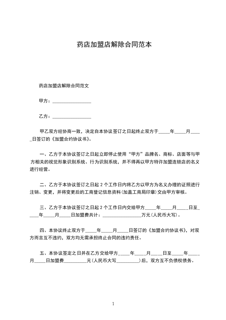 1.乙方自愿申请加入“_________公司”“_________”加盟店,一旦经甲方审核批准后不得随意退出,如果申请退出,甲方不负责退货,并自动取消其所有一切待遇。