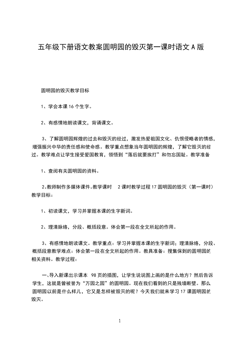 2、教师制作多媒体课件。教学课时2课时教学过程17圆明园的毁灭(第一课时)教学目标: