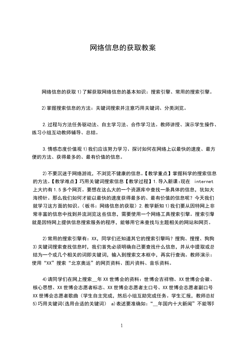 2)不要沉迷于网络游戏,不浏览不健康的信息。【教学重点】掌握科学的搜索信息的方法。【教学难点】巧用关键词搜索信息【教学过程】1.导入新课:现在internet上大约有1.5多个网页。要想在这么大的一个资源库中查找一条具体的信息,犹如大海捞针。那么我们如何才能以最快的速度获得最多的、最有价值的信息呢?今天我们就学习这方面的知识。(板书:网络信息的获取)2.教学新知1)我们要从因特网上非常丰富的信息中找到并流浏览这些信息,需要使用一个网络工具搜索引擎。搜索引擎就是因特网上提供信息搜索服务的程序,能够用它来查找与主题相关的网站和网页。