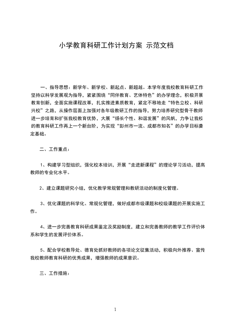 一、指导思想:新学年、新学校、新起点、新超越。本学年度我校教育科研工作坚持以科学发展观为指导,紧紧围绕“同伴教育、艺体特色”的办学理念,积极开展教育创新,全面实施课程改革,扎实推进素质教育,紧定不移地走“特色立校、科研兴校”之路,从操作层面上加强对各年级教研工作的指导,努力培养研究型骨干教师,进一步培育和扩张我校教育优势,大展“扬长个性、和谐发展”的风帆,力争让我校的教育科研工作再上一个新台阶,为实现“彭州市一流、成都市知名”的办学目标奠定基础。