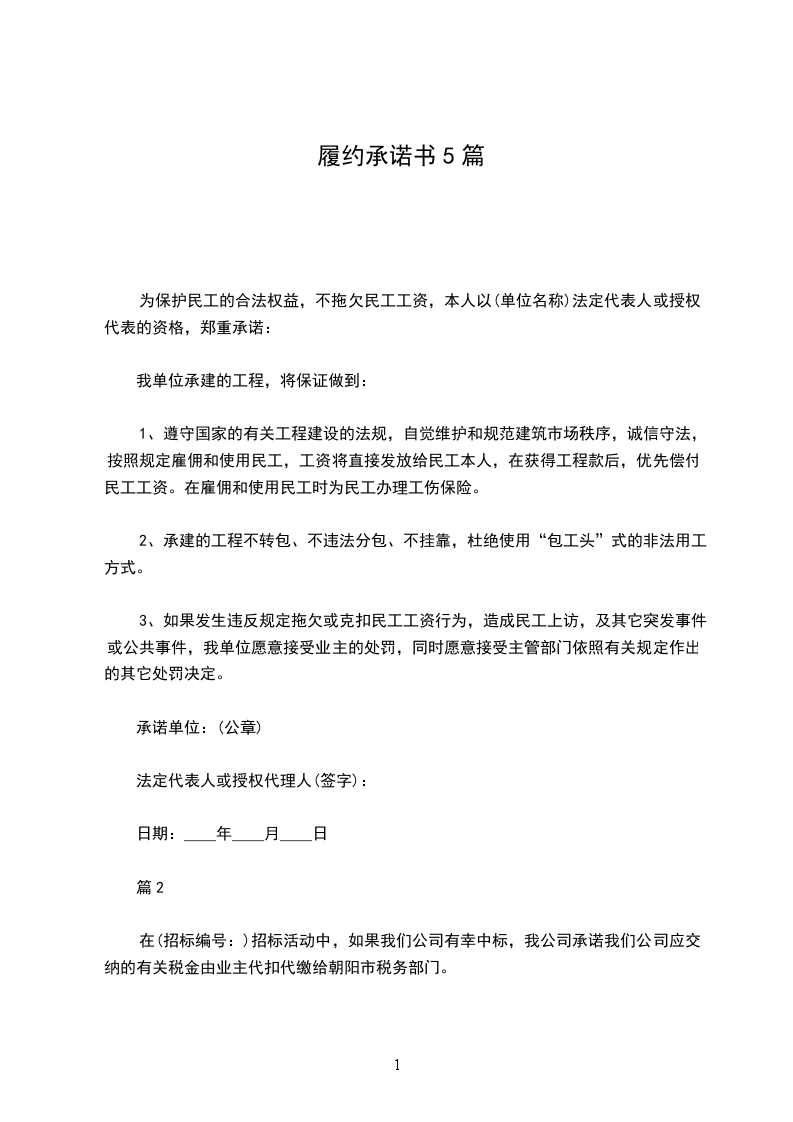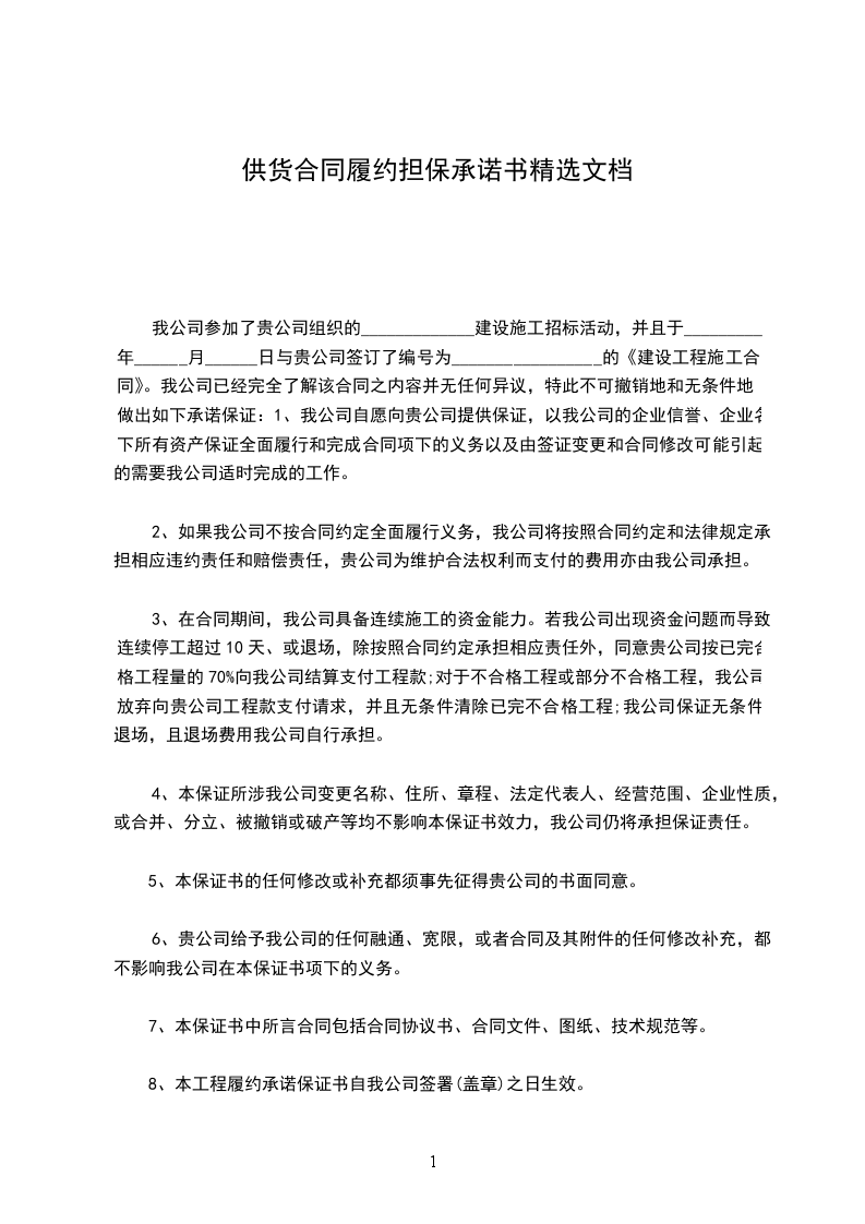 我公司参加了贵公司组织的_____________建设施工招标活动,并且于_________年______月______日与贵公司签订了编号为_________________的《建设工程施工合同》。我公司已经完全了解该合同之内容并无任何异议,特此不可撤销地和无条件地做出如下承诺保证:1、我公司自愿向贵公司提供保证,以我公司的企业信誉、企业名下所有资产保证全面履行和完成合同项下的义务以及由签证变更和合同修改可能引起的需要我公司适时完成的工作。