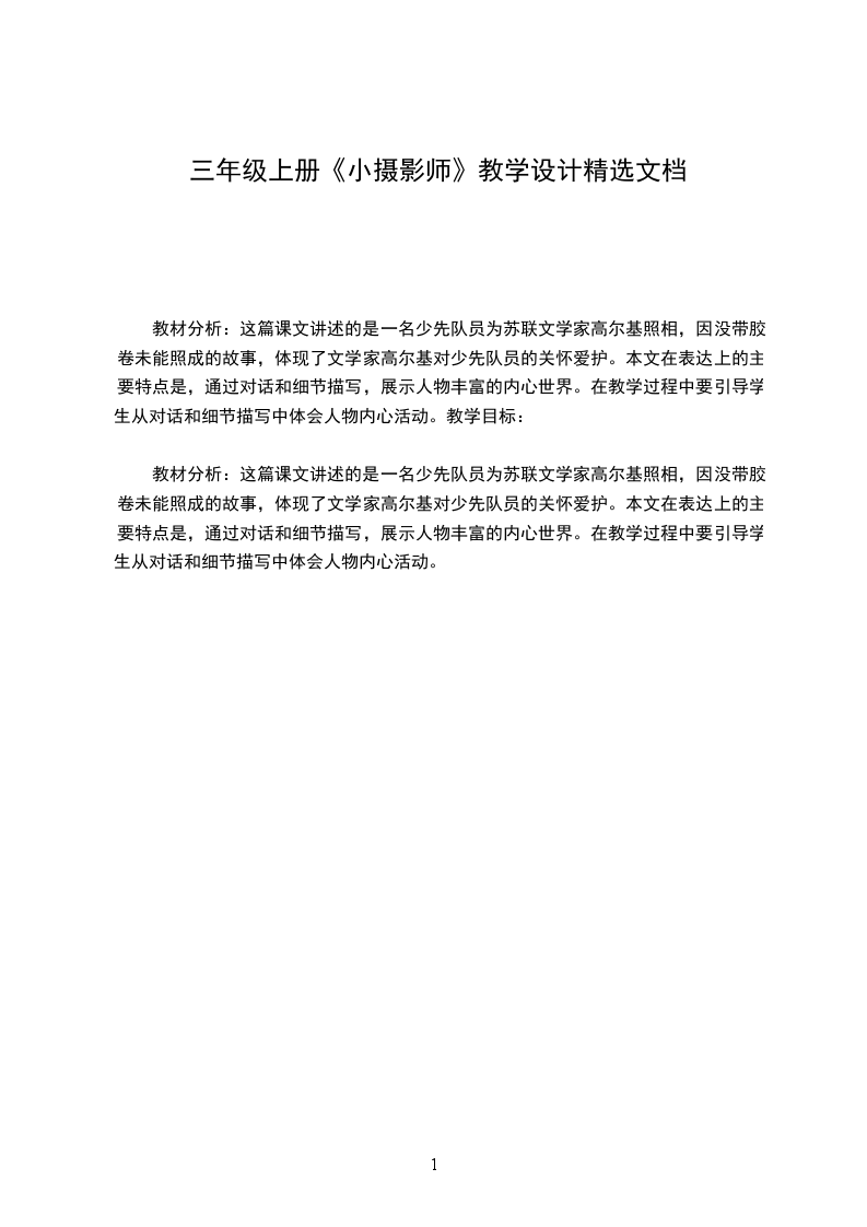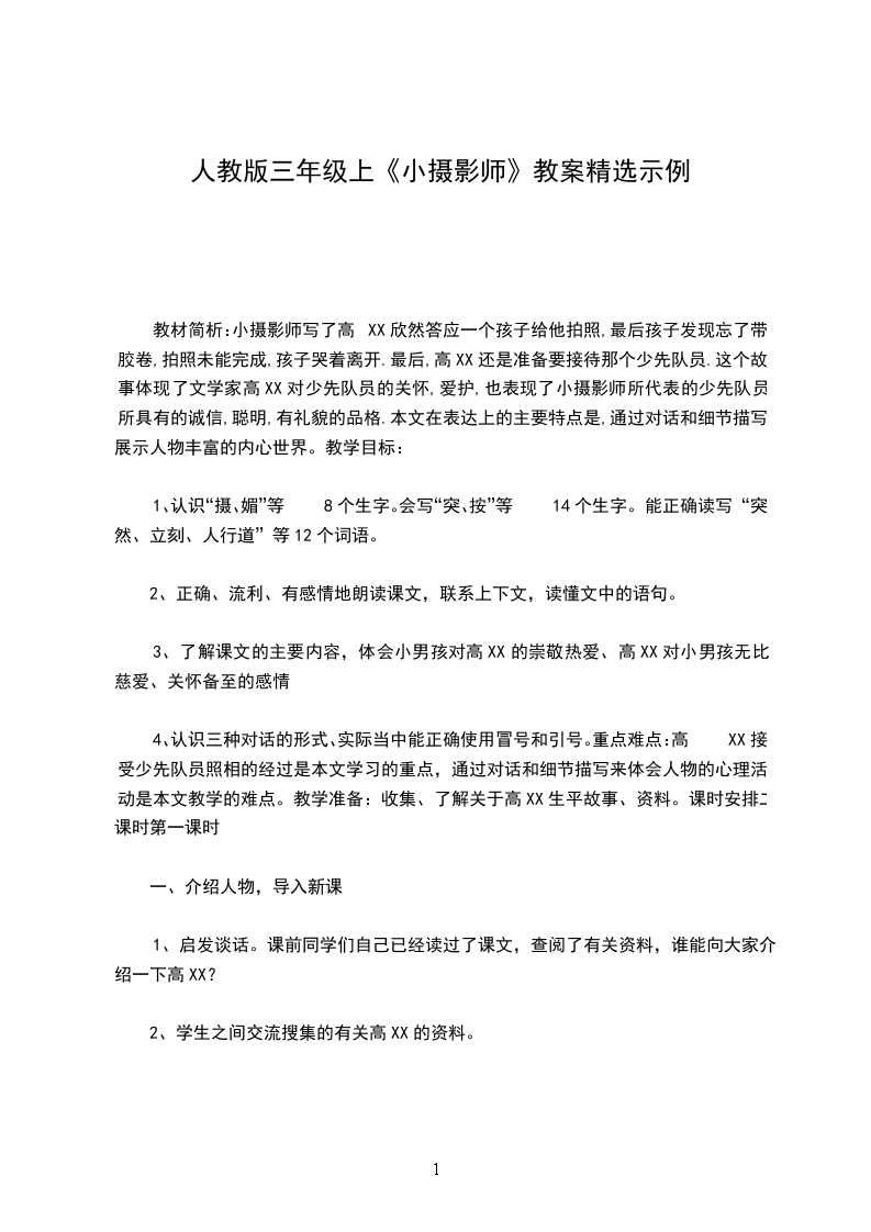 教材简析:小摄影师写了高XX欣然答应一个孩子给他拍照,最后孩子发现忘了带胶卷,拍照未能完成,孩子哭着离开.最后,高XX还是准备要接待那个少先队员.这个故事体现了文学家高XX对少先队员的关怀,爱护,也表现了小摄影师所代表的少先队员所具有的诚信,聪明,有礼貌的品格.本文在表达上的主要特点是,通过对话和细节描写,展示人物丰富的内心世界。教学目标: