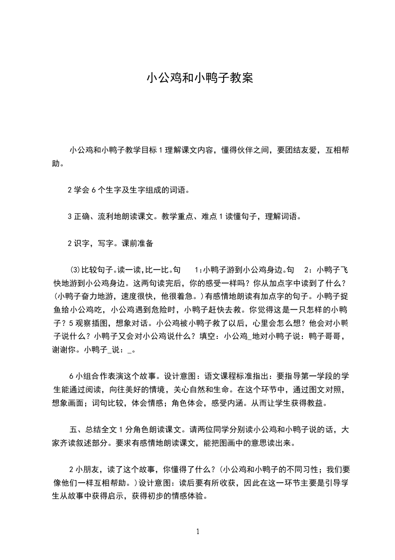 四、布置作业讲一讲。回家把这个故事讲给爸爸妈妈听。教学反思小公鸡和小鸭子是一篇浅显易懂的童话故事,内容很符合一年级学生的年龄特点,孩子们学起来特别感兴趣。在本次教学实践中,我觉得有两点做得比较好。