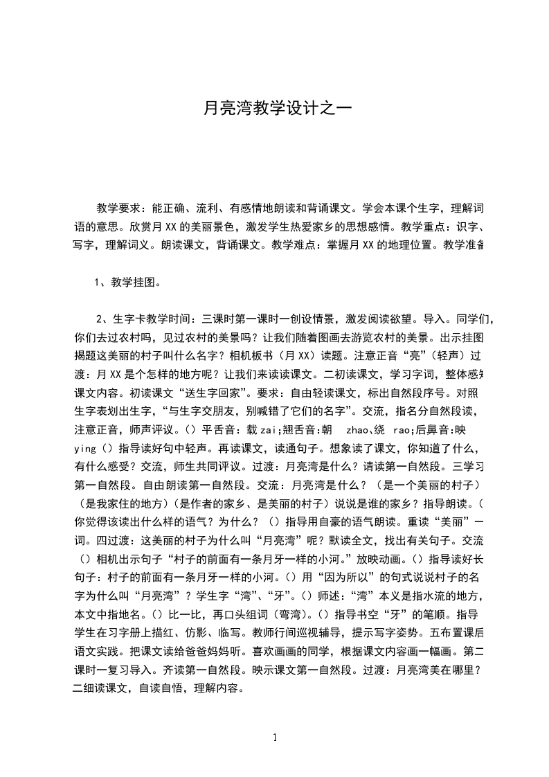 2、生字卡教学时间:三课时第一课时一创设情景,激发阅读欲望。导入。同学们,你们去过农村吗,见过农村的美景吗?让我们随着图画去游览农村的美景。出示挂图。揭题这美丽的村子叫什么名字?相机板书(月XX)读题。注意正音“亮”(轻声)过渡:月XX是个怎样的地方呢?让我们来读读课文。二初读课文,学习字词,整体感知课文内容。初读课文“送生字回家”。要求:自由轻读课文,标出自然段序号。对照生字表划出生字,“与生字交朋友,别喊错了它们的名字”。交流,指名分自然段读,注意正音,师声评议。()平舌音:载zai;翘舌音:朝zhao、绕rao;后鼻音:映ying()指导读好句中轻声。再读课文,读通句子。想象读了课文,你知道了什么,有什么感受?交流,师生共同评议。过渡:月亮湾是什么?请读第一自然段。三学习第一自然段。自由朗读第一自然段。交流:月亮湾是什么?(是一个美丽的村子)(是我家住的地方)(是作者的家乡、是美丽的村子)说说是谁的家乡?指导朗读。()你觉得该读出什么样的语气?为什么?()指导用自豪的语气朗读。重读“美丽”一词。四过渡:这美丽的村子为什么叫“月亮湾”呢?默读全文,找出有关句子。交流。()相机出示句子“村子的前面有一条月牙一样的小河。”放映动画。()指导读好长句子:村子的前面有一条月牙一样的小河。()用“因为所以”的句式说说村子的名字为什么叫“月亮湾”?学生字“湾”、“牙”。()师述:“湾”本义是指水流的地方,本文中指地名。()比一比,再口头组词(弯湾)。()指导书空“牙”的笔顺。指导学生在习字册上描红、仿影、临写。教师行间巡视辅导,提示写字姿势。五布置课后语文实践。把课文读给爸爸妈妈听。喜欢画画的同学,根据课文内容画一幅画。第二课时一复习导入。齐读第一自然段。映示课文第一自然段。过渡:月亮湾美在哪里?二细读课文,自读自悟,理解内容。