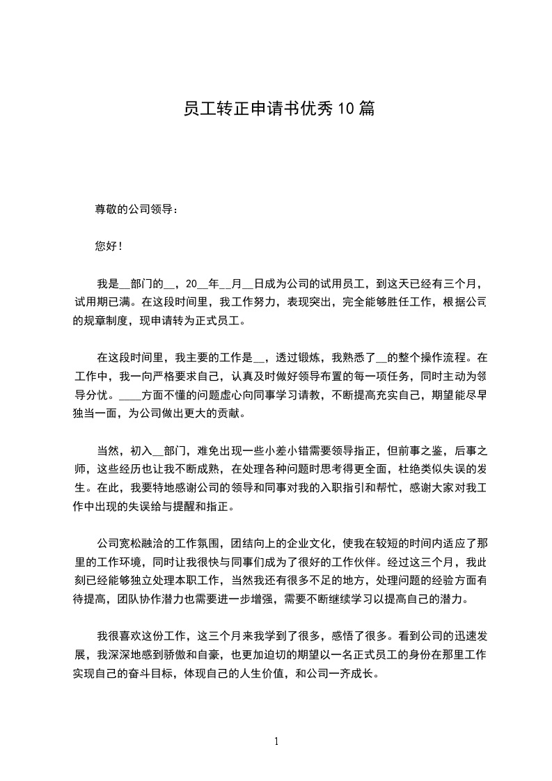 我是__部门的__,__年_月_日成为贵公司的试用员工,到今天已经有_个月,试用期已满。在这段时间里,我自认能够完全胜任工作,根据公司的规章制度,现申请转为正式员工。