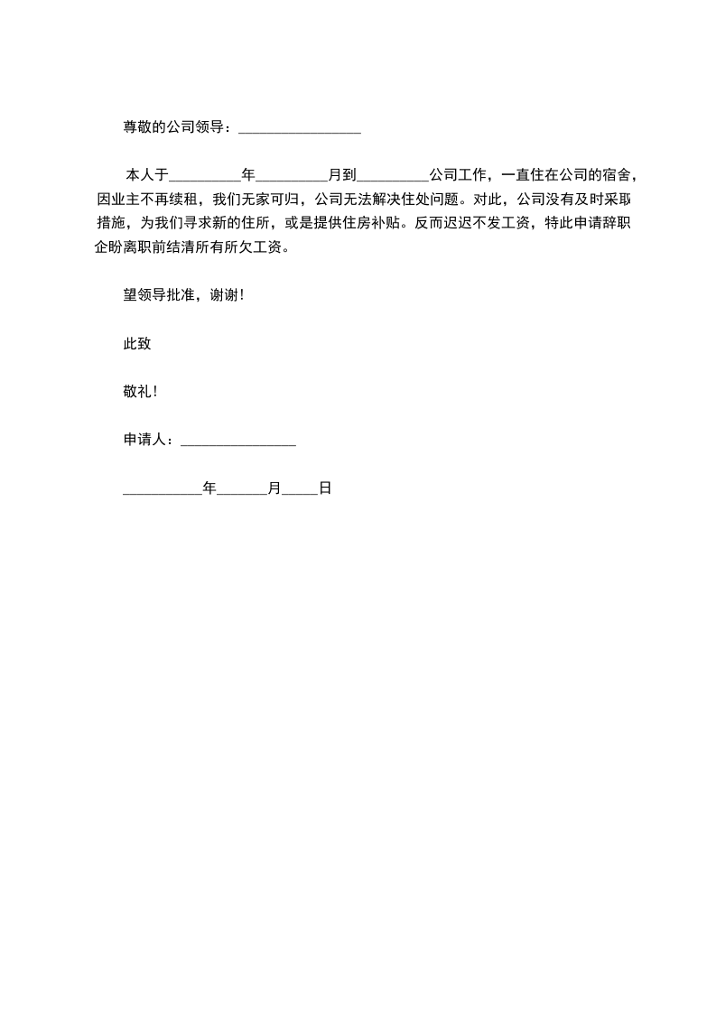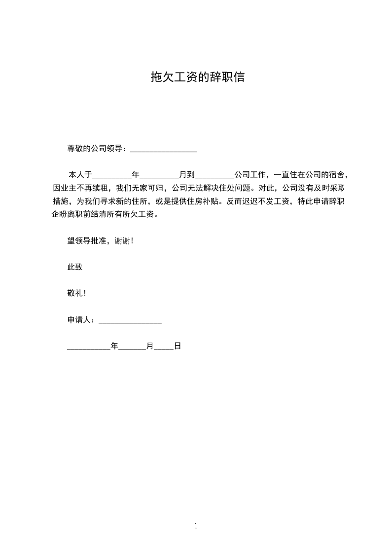 尊敬的领导:您好!各位领导,我带着复杂的心情写这封次致信。由于您对我的能力的信任,使我得以加入公司,并且在短短的两年间获得了许多的机遇和挑战。经过这两年在公司从事的__开发和__管理工作,使我在__开发,__管理等领域学到了很多知识、积累了一定的经验。对此我深怀感激!由于拖欠薪金的原因,我不得不向公司提出辞职,并将与今年_月__日正式离职,希望公司将拖欠的工资尽快结清于我。对于由此为公司造成的不便,我深感抱歉。此致敬礼!申请人:_______年__月__日