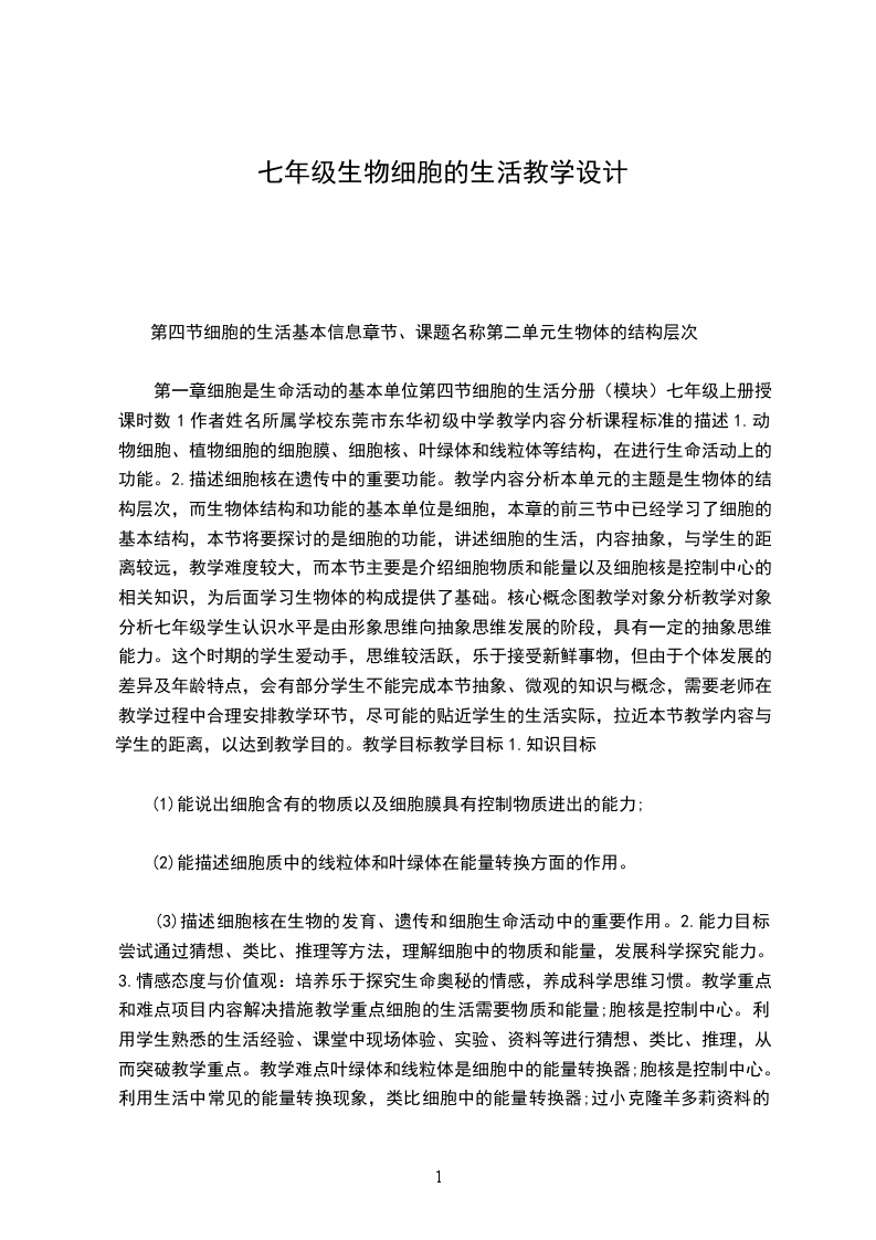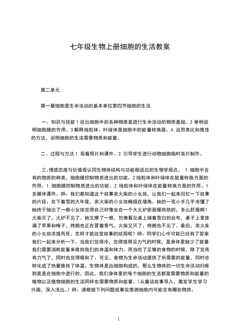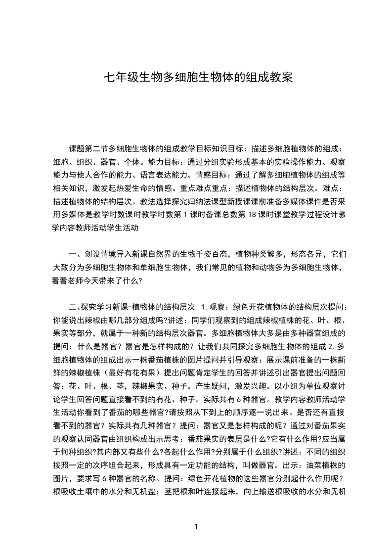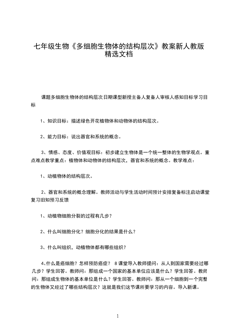 1、知识目标:描述绿色开花植物体和动物体的结构层次。