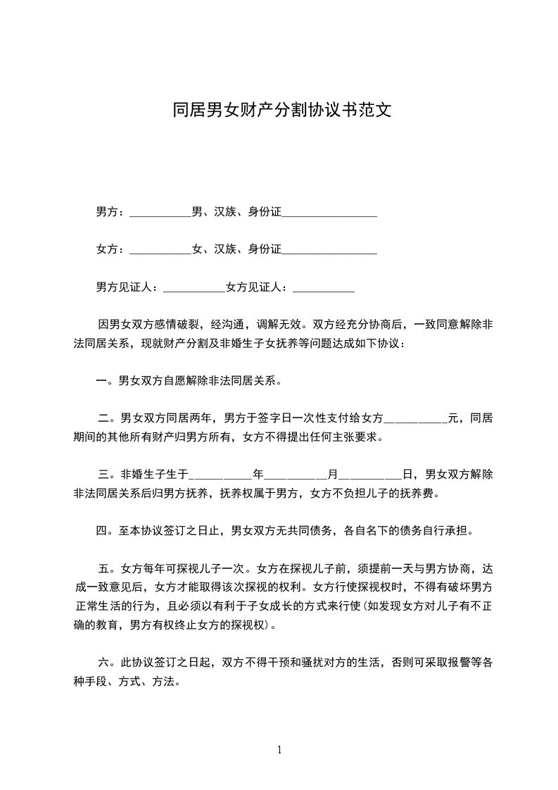 二。男女双方同居两年,男方于签字日一次性支付给女方___________元,同居期间的其他所有财产归男方所有,女方不得提出任何主张要求。