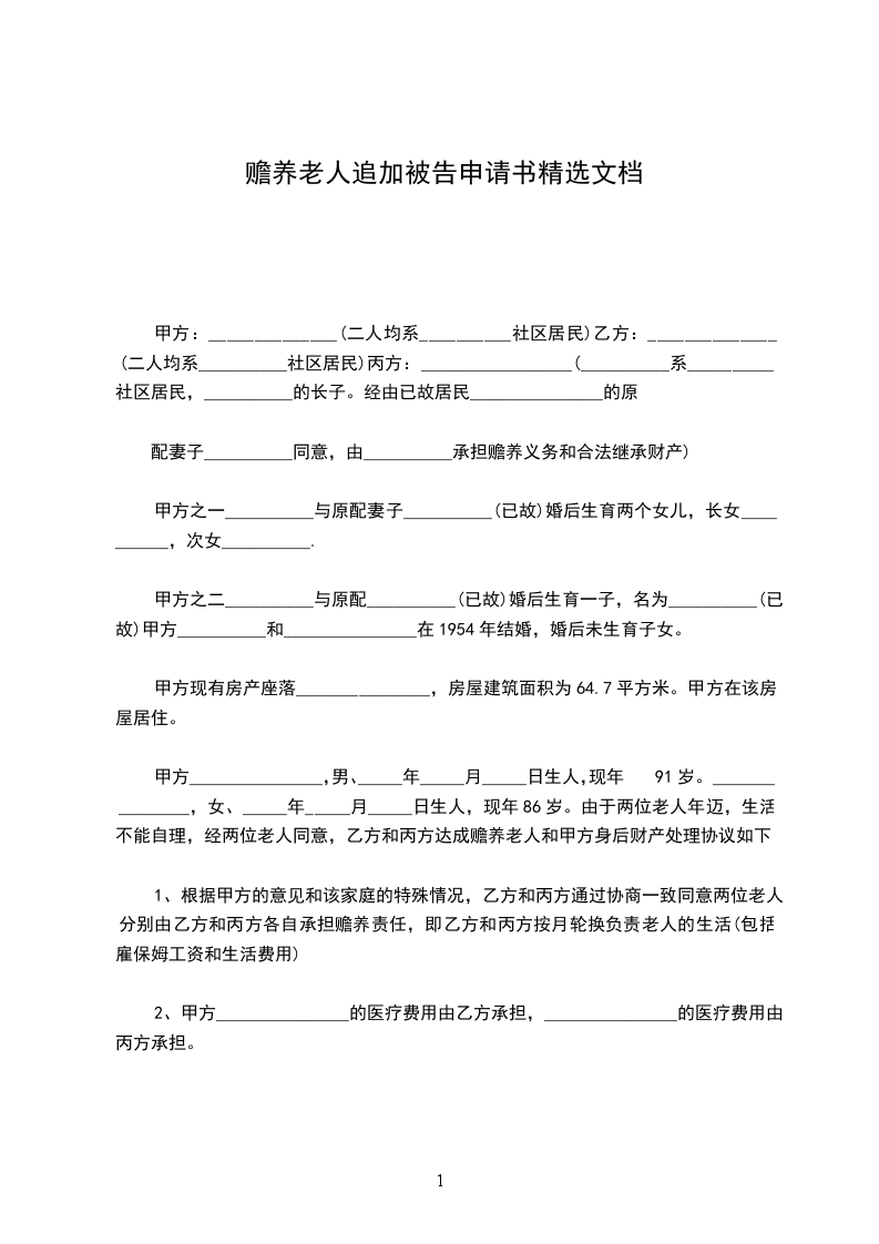 甲方_______________,男、_____年_____月_____日生人,现年91岁。_______________,女、_____年_____月_____日生人,现年86岁。由于两位老人年迈,生活不能自理,经两位老人同意,乙方和丙方达成赡养老人和甲方身后财产处理协议如下: