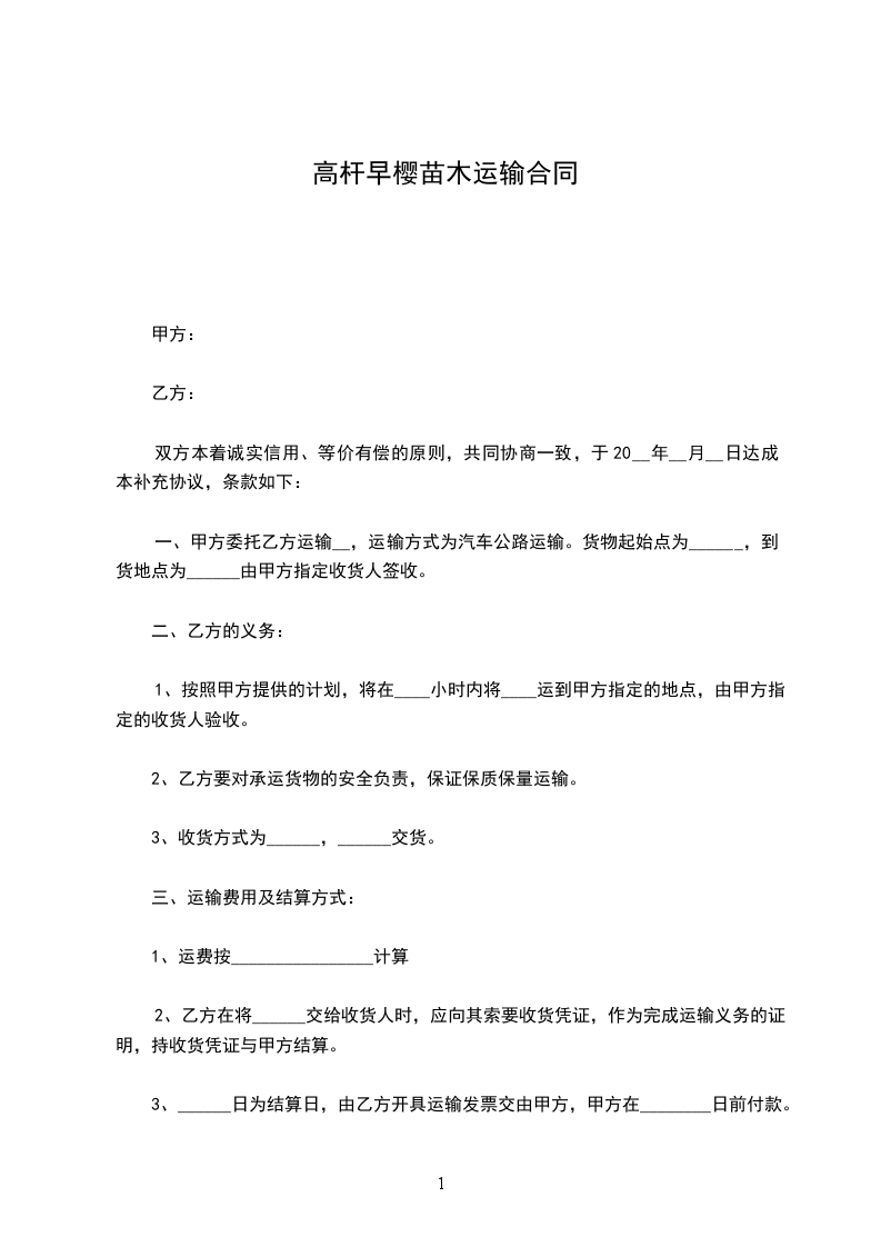 一、甲方委托乙方运输的苗木数量初步定为_____万株,分批运输,每次运输数量和地点双方临时协商而定,运输费用以实际运输数量结算。