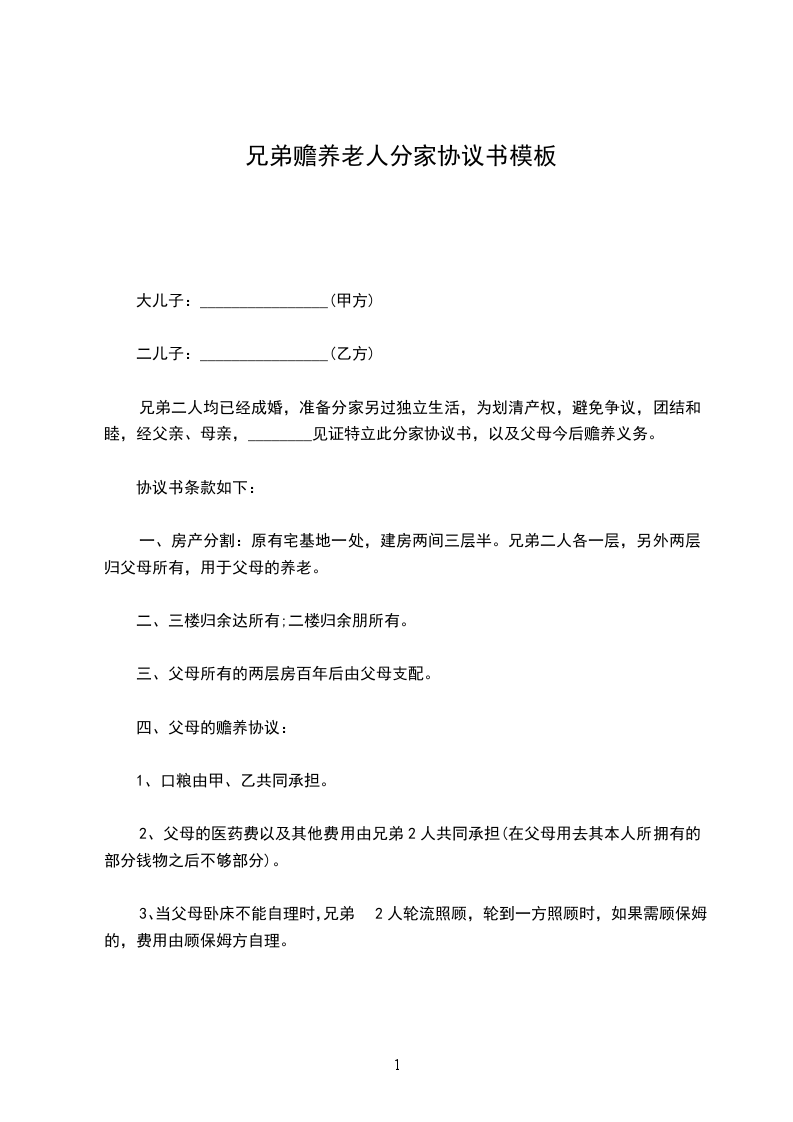 五、本协议共1页一式三份,父和母、甲、乙各执一份,一经签字按手印,兄弟双方对以上协议均不得反悔。未尽事宜兄弟二人协商解决。