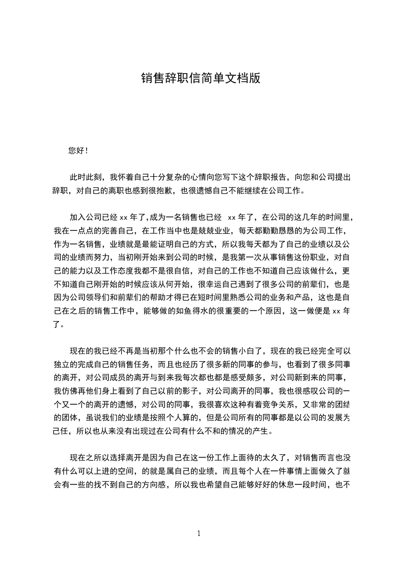 销售辞职信简单篇十