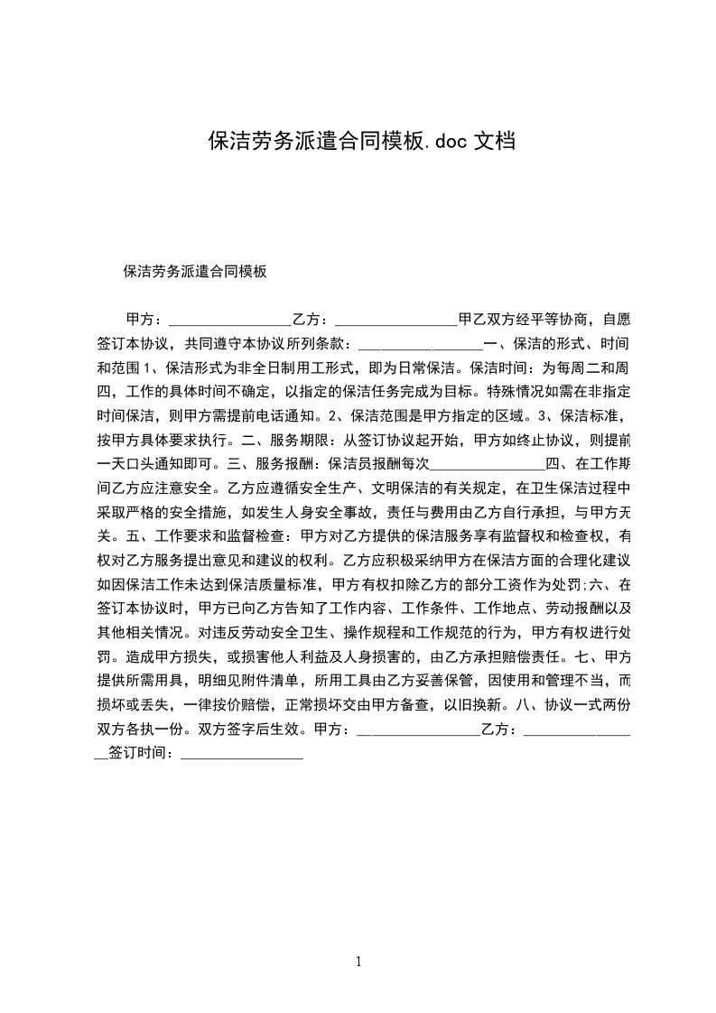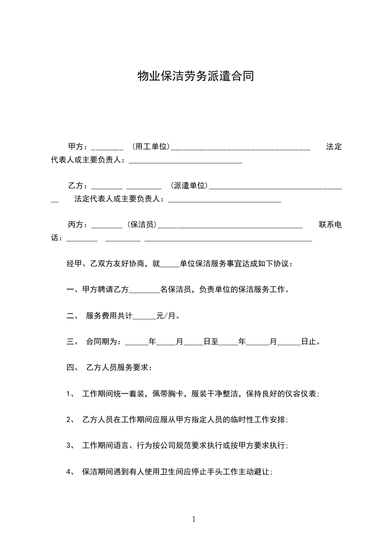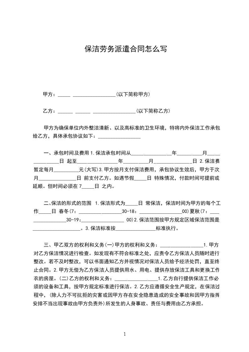 二、保洁的形式的范围1.保洁形式为日常保洁,保洁时间为甲方的每个工作日春冬(7:_________________30-18:_________________00)夏秋(7:_________________30-19:_________________00)2.保洁范围按甲方规定区域保洁范围是___________________。3.保洁标准按________________标准执行。